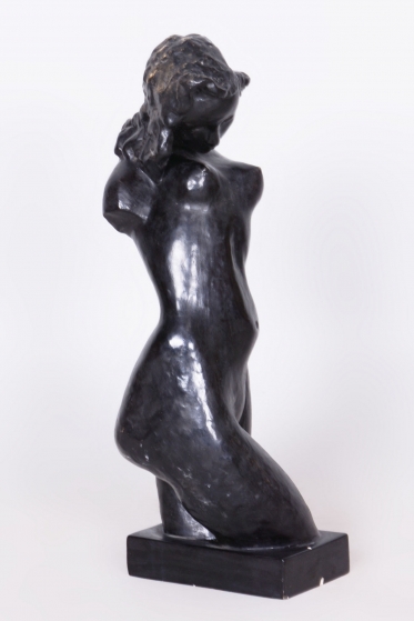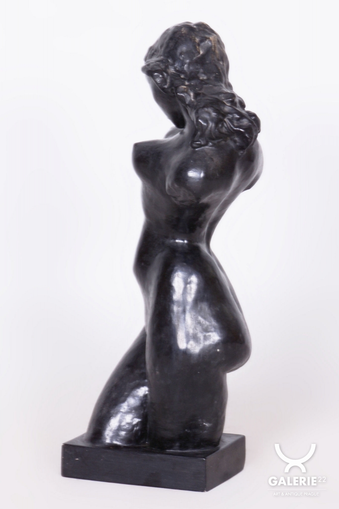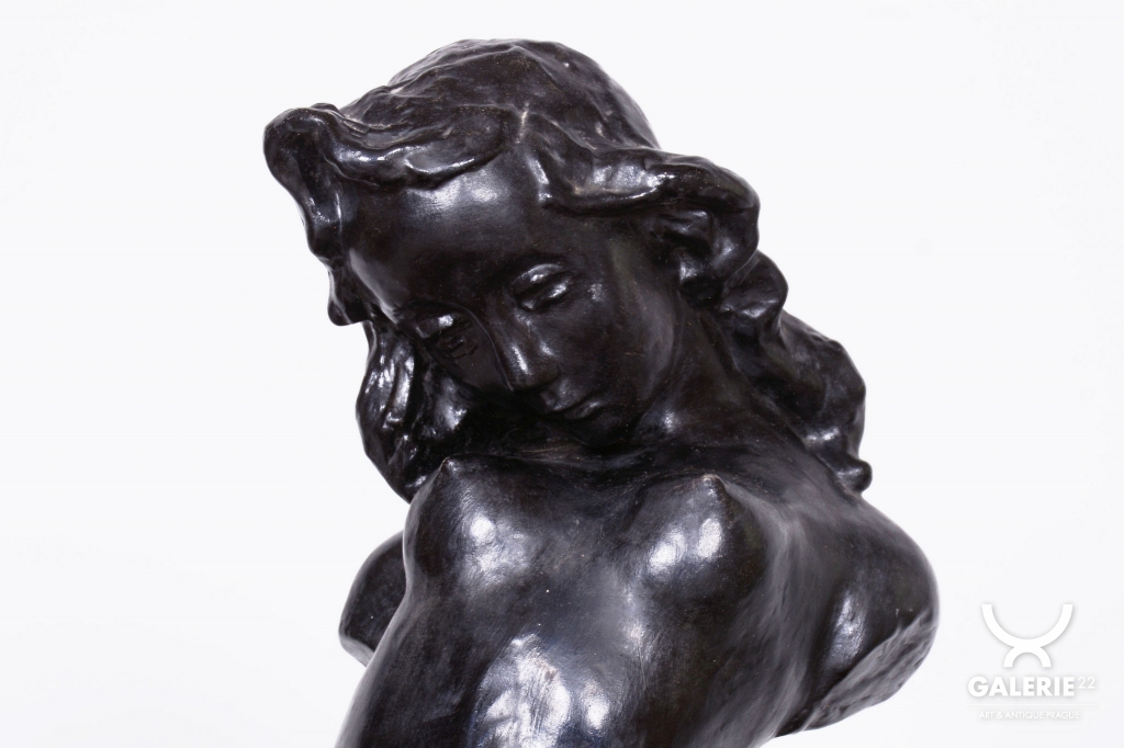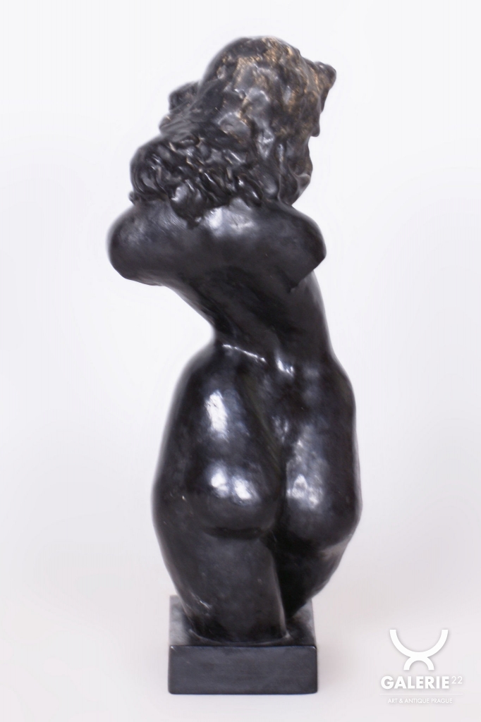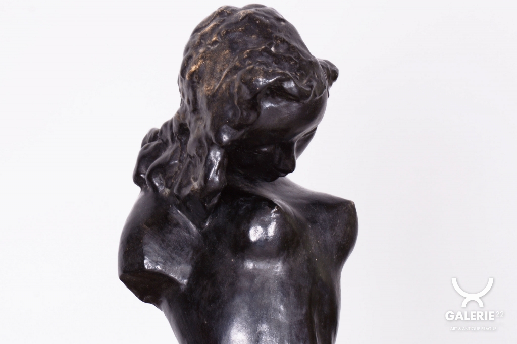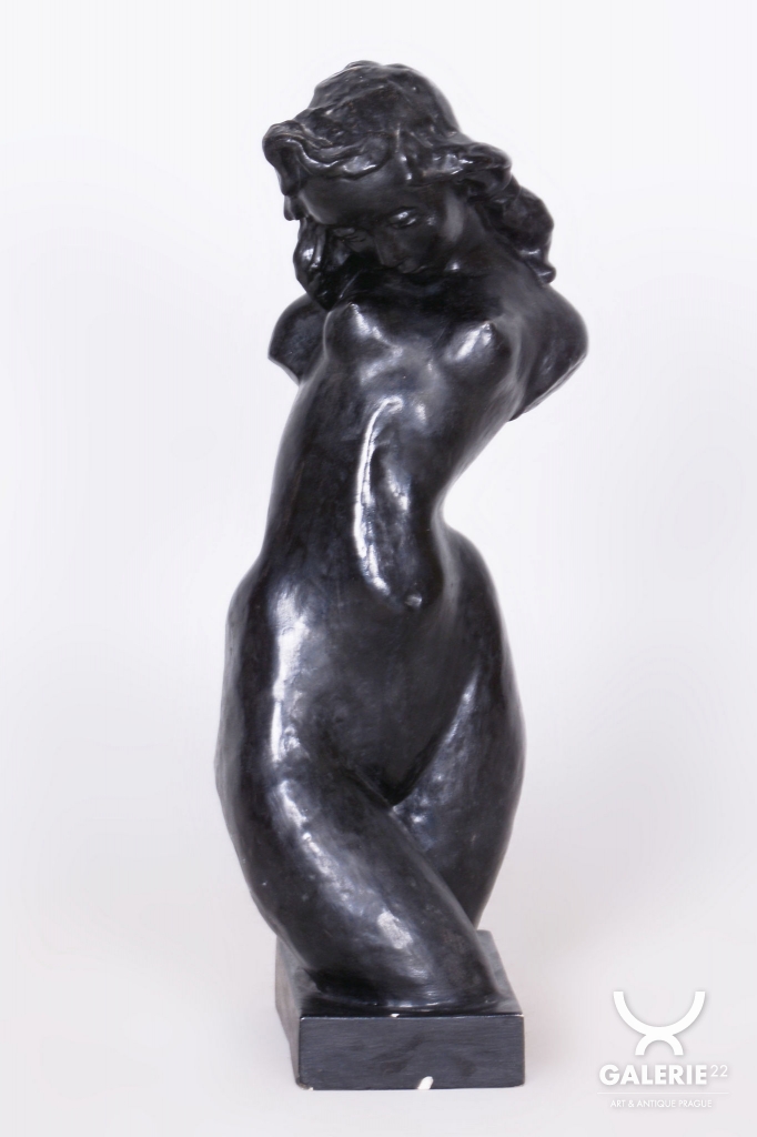 Plastika je vyrobena z patinované sádry, což byla v daném období velmi oblíbená technika umožňující dosáhnout sofistikovaných povrchových nuancí. Soška se dochovala v původním stavu, což je pro sběratele nesmírně cenné, neboť si zachovala autentickou patinu a veškeré detaily autorova rukopisu. Jde o citlivý umělecký doplněk, který skvěle doplňuje dobové interiéry a reprezentuje vysokou úroveň československého figurálního sochařství první republiky.