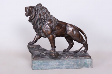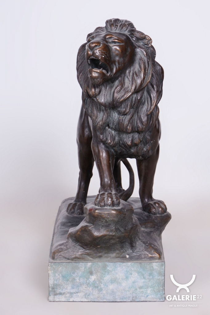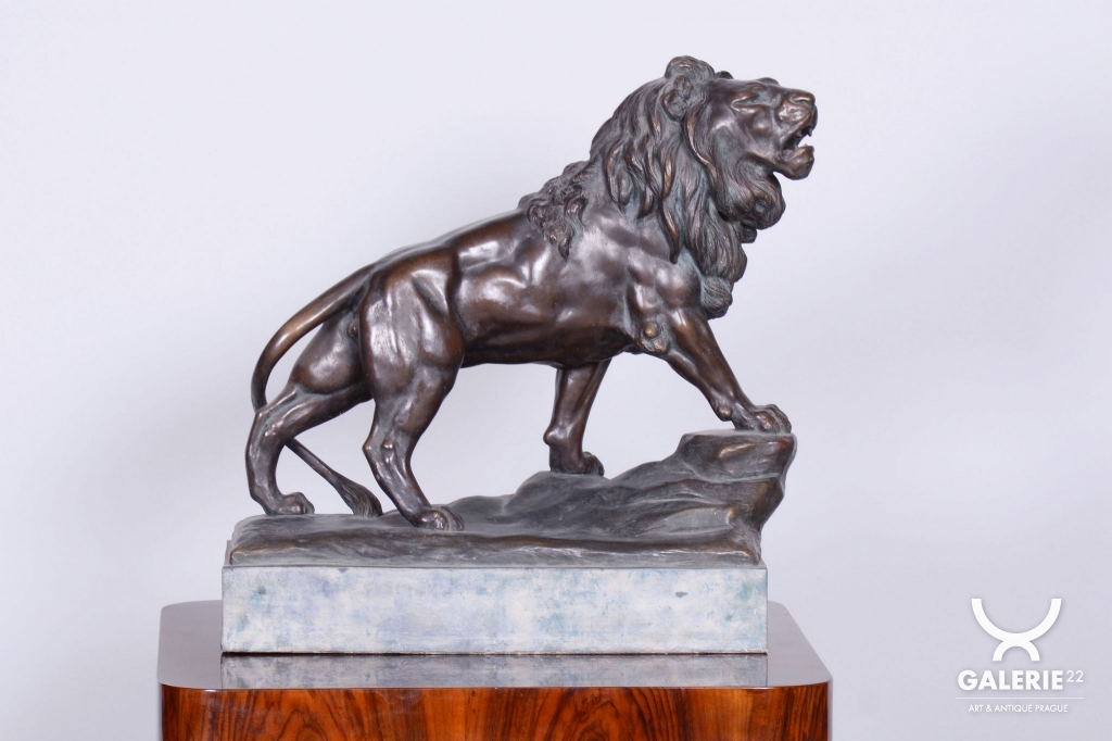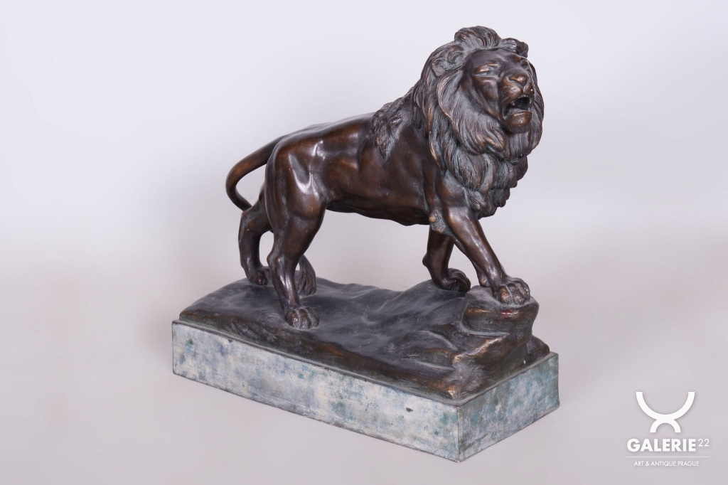 Tato monumentální socha lva je fascinující ukázkou rakouské produkce z období Art Deca ze začátku 20. století. Předmět pochází z dílny proslulé vídeňské manufaktury Goldscheider, která patřila k absolutní světové špičce ve výrobě umělecké keramiky a bronzových plastik. Socha je signována jménem Cherc, což odkazuje na konkrétního autora tohoto dynamického návrhu, jenž zachycuje sílu a majestátnost zvířete v typicky artdecové stylizaci.