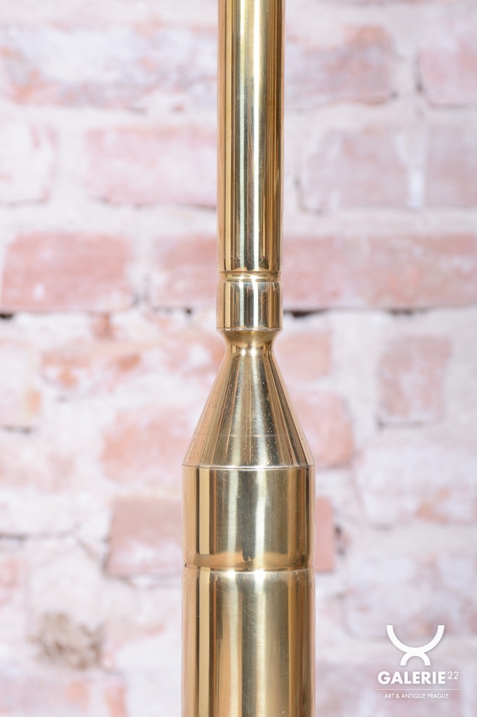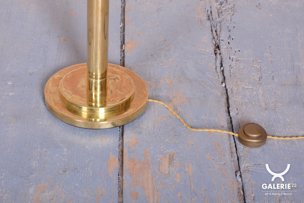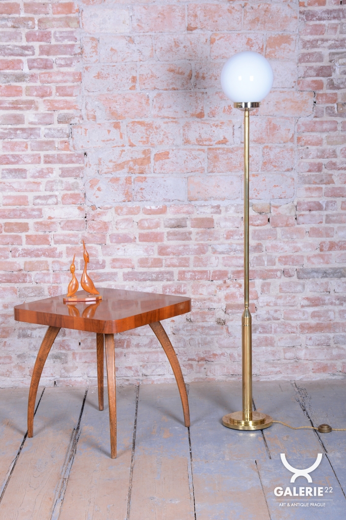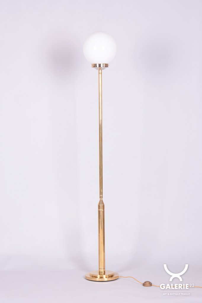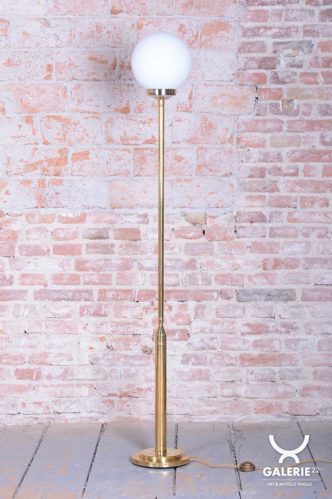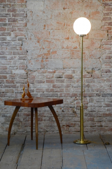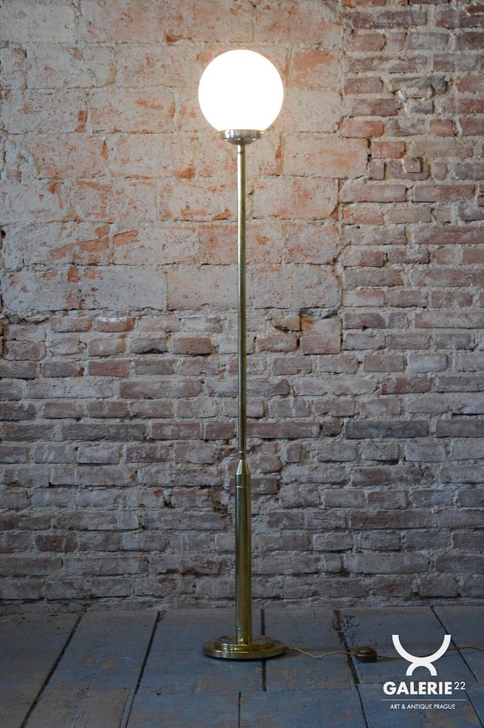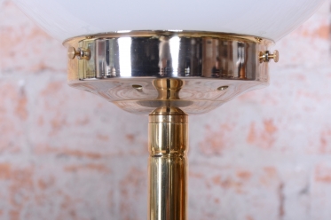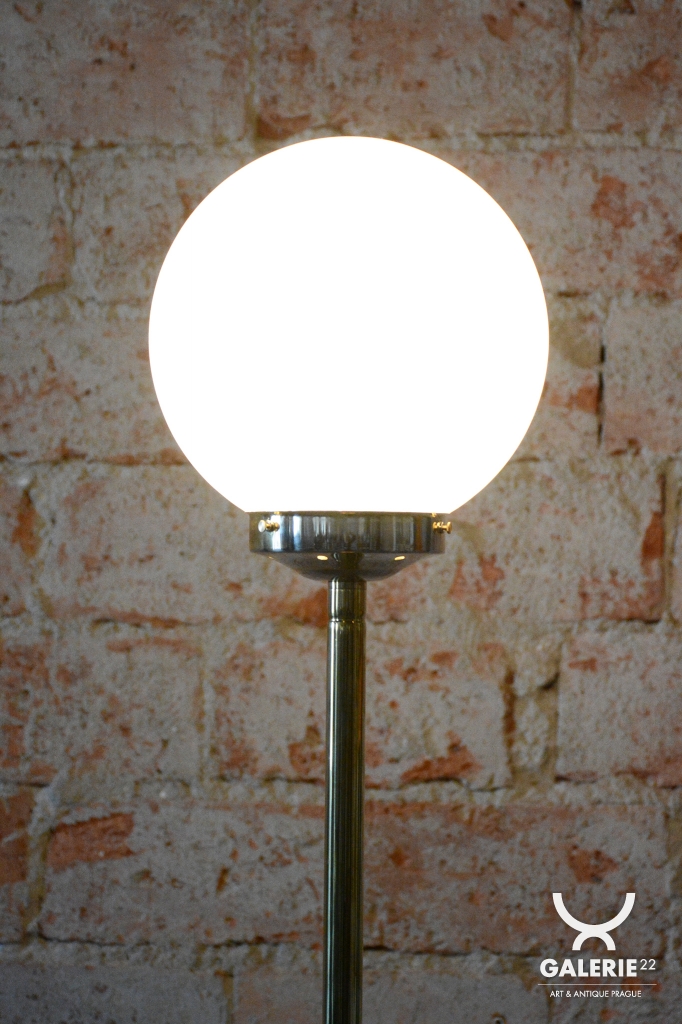 Lampa je zhotovena z mosazi s teplým zlatavým tónem, která byla profesionálně vyčištěna a zrestaurována. Je osazena jednoduchým a nadčasovým opálovým skleněným stínidlem ve tvaru koule, které zajišťuje příjemné, rovnoměrné rozptýlené světlo.