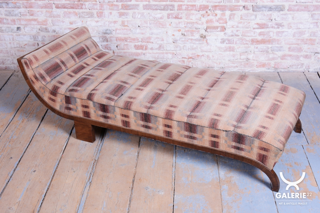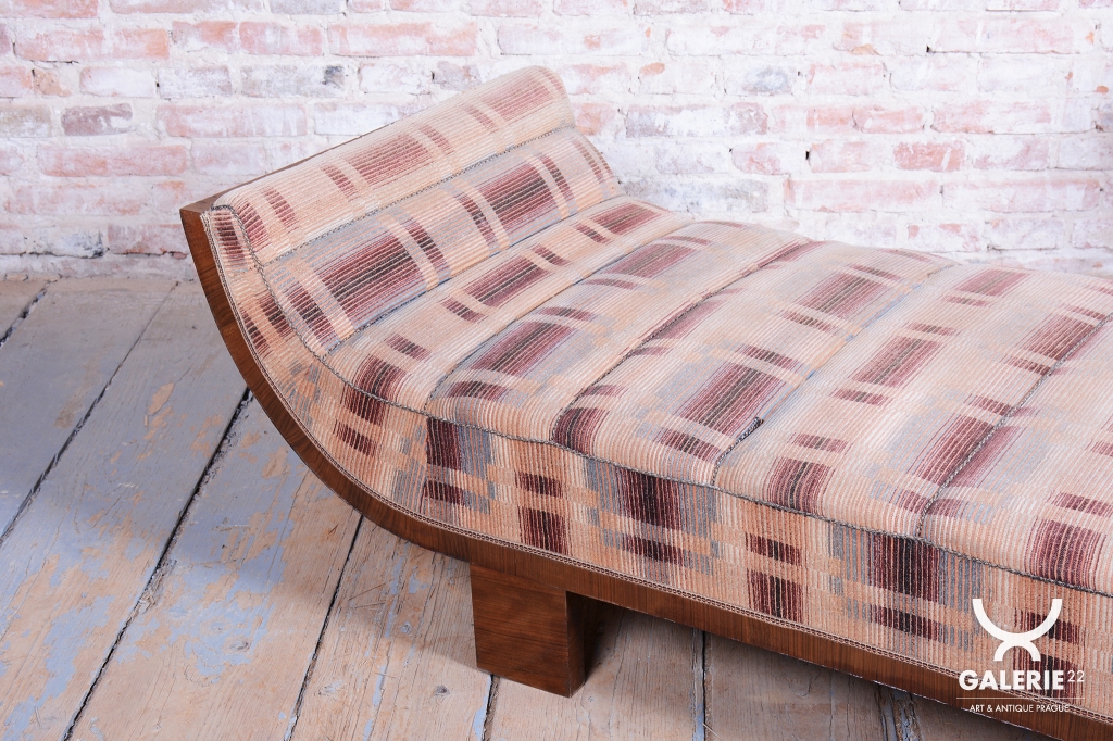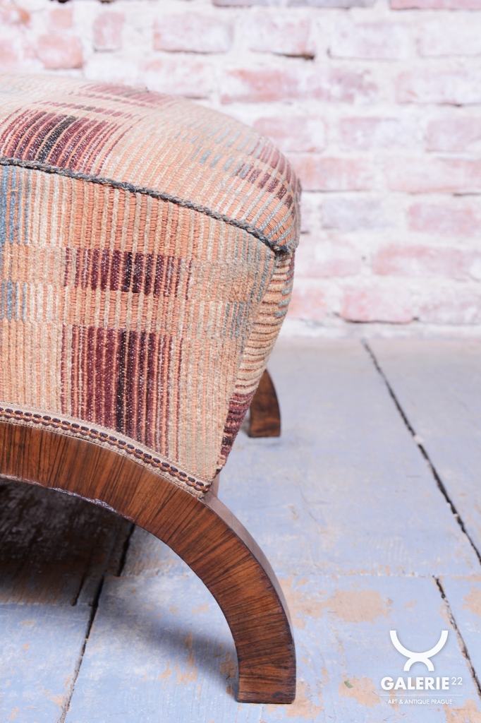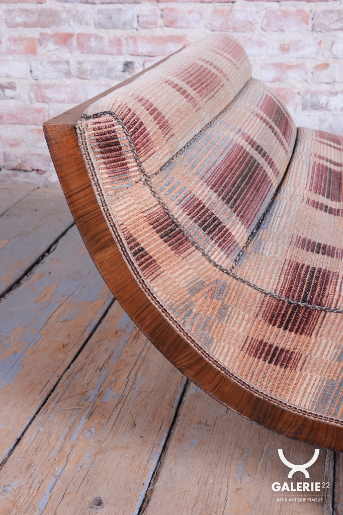 Tato elegantní pohovka ve stylu Art Deco je ikonickým kusem z Československa z 20. let 20. století. Její zaoblené tvary a sofistikovaný design jsou typické pro tuto éru a ztělesňují luxus a pohodlí.