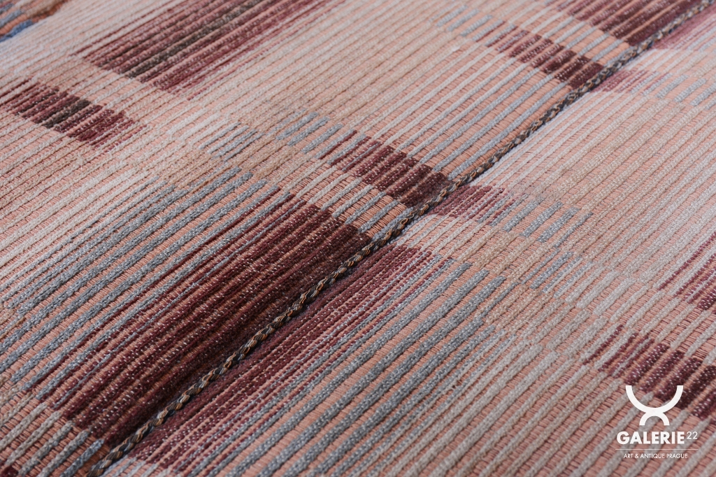 Velkou hodnotu představuje zachovalé původní čalounění s geometrickým vzorem, které bylo odborně strojově čištěno, což zaručuje hygienu při zachování originality.