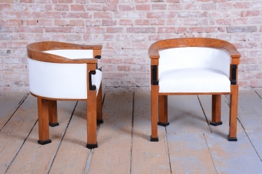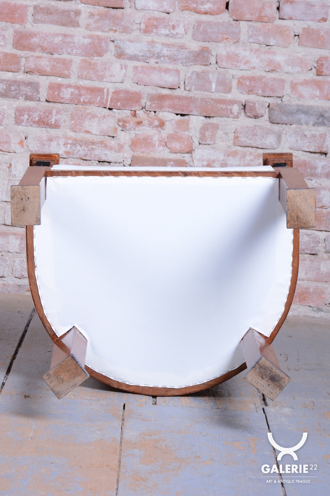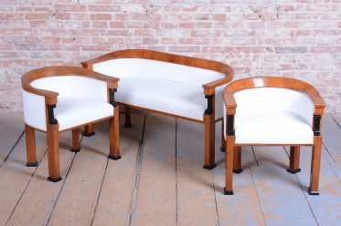 Souprava prošla kompletní renovací. Dřevěné části mají oživenou původní polituru, která zvýrazňuje krásu dýhy. Čalounění je nové a profesionální, provedené v elegantní bílé umělé kůži. Díky pevné a stabilní konstrukci je souprava připravena k dlouhodobému používání.