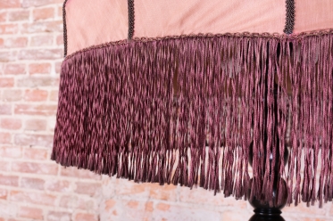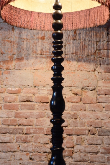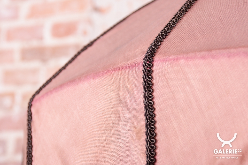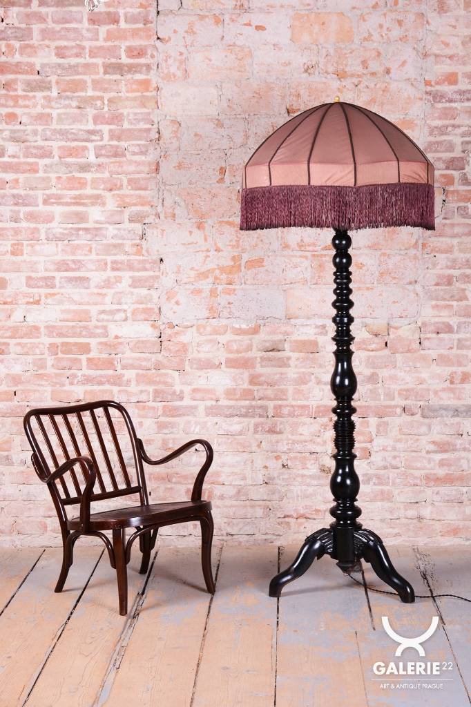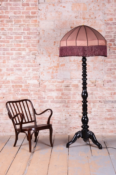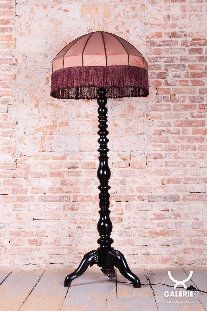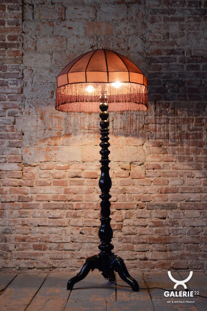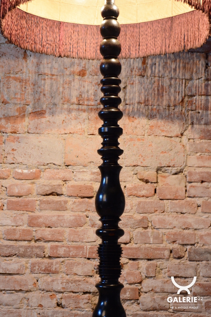 Lampa má výraznou soustruženou nohu zhotovenou z kvalitního bukového dřeva. Povrch prošel pečlivým restaurováním, při kterém byla oživena původní politura, což dřevu navrátilo jeho přirozený lesk a hloubku. Dominantou je bohatě zdobené textilní stínidlo s třásněmi, které v interiéru vytváří příjemnou atmosféru. Předmět je plně funkční a díky nové elektrifikaci je připraven k okamžitému a bezpečnému užívání.