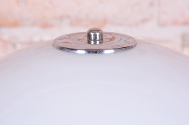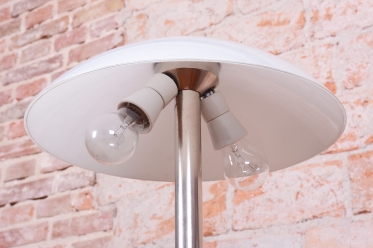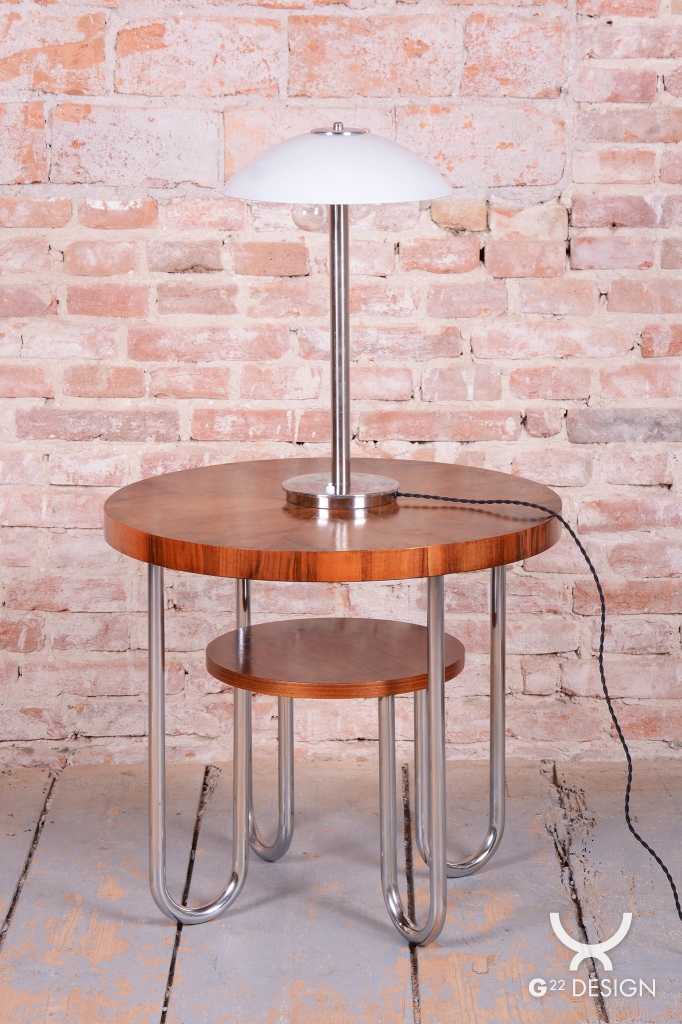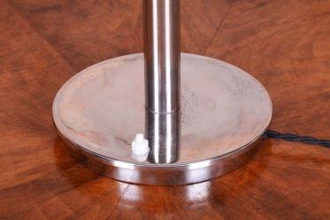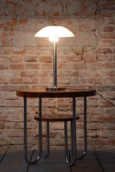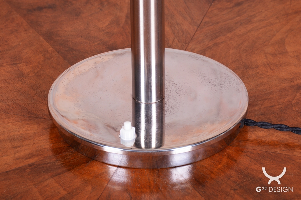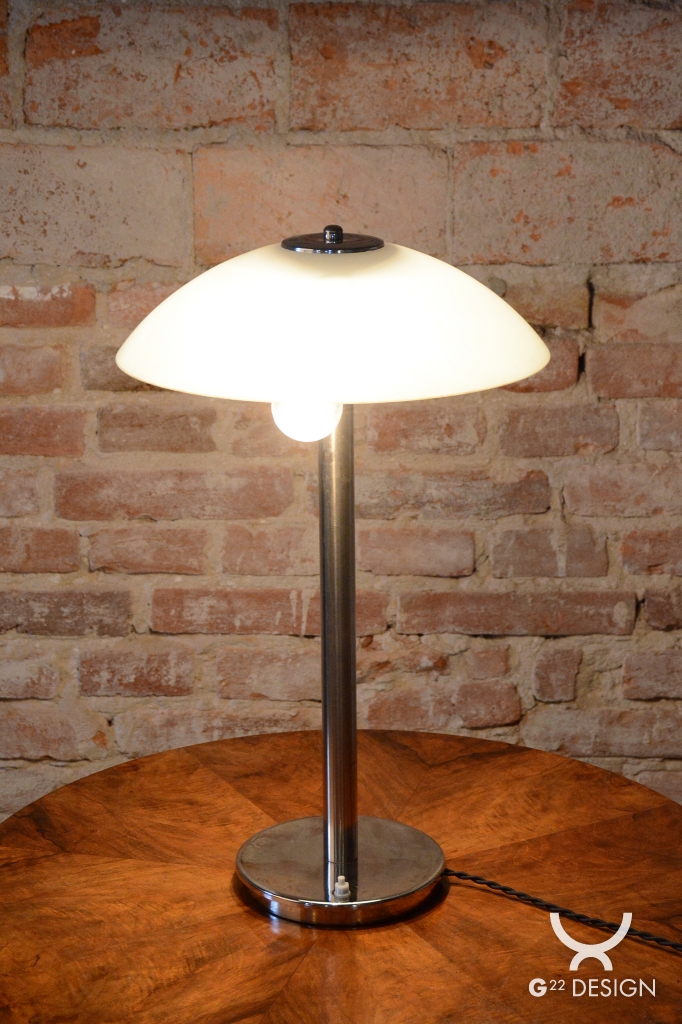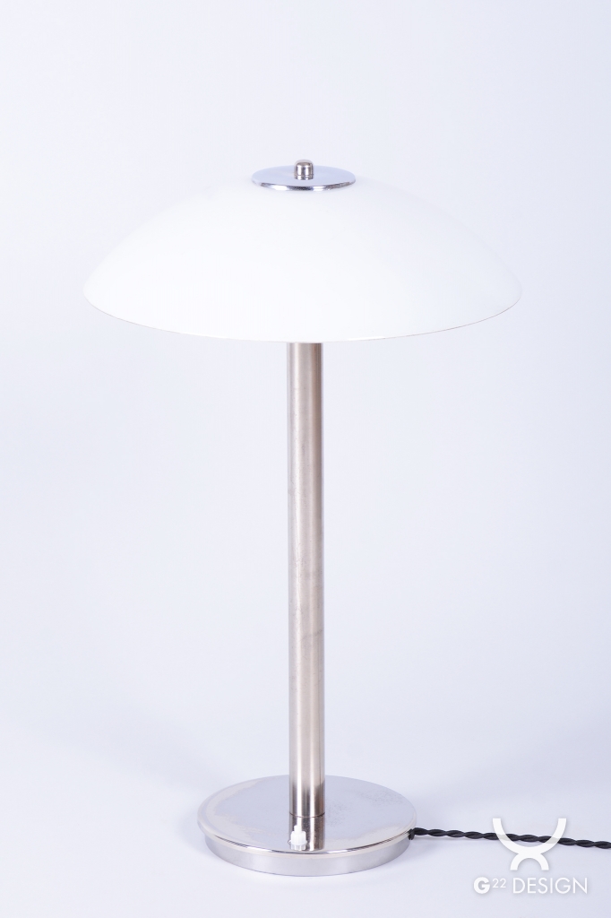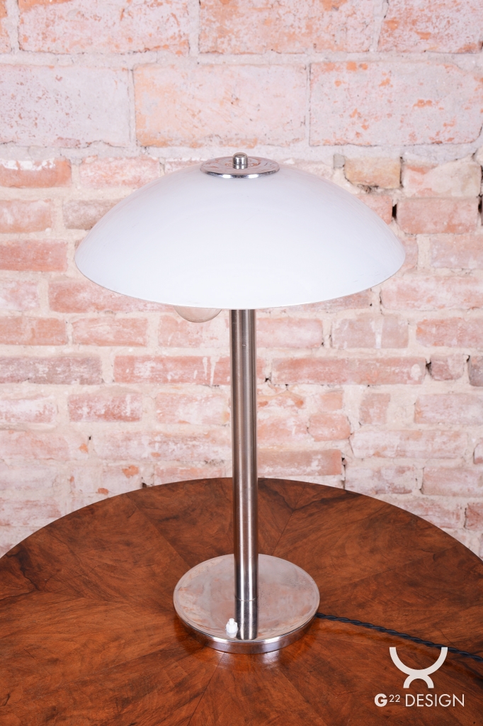 Tato elegantní stolní lampa je klasickým představitelem stylu Bauhaus a byla vyrobena v Československu v 30. letech 20. století. Konstrukce lampy je zhotovena z chromované oceli, kterou doplňuje minimalistické stínidlo z bílého opálového skla.
