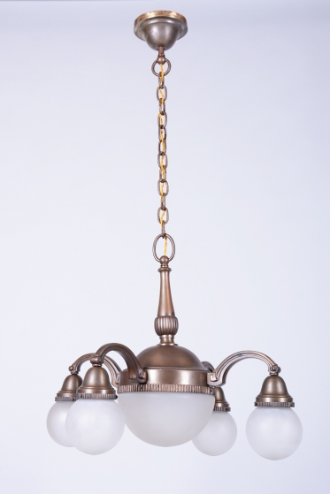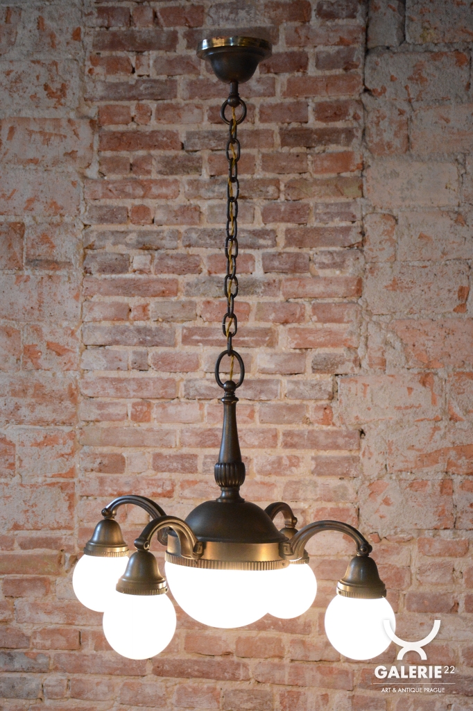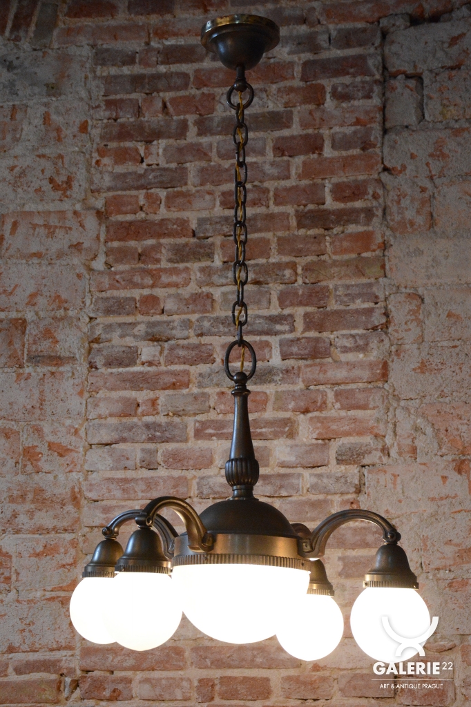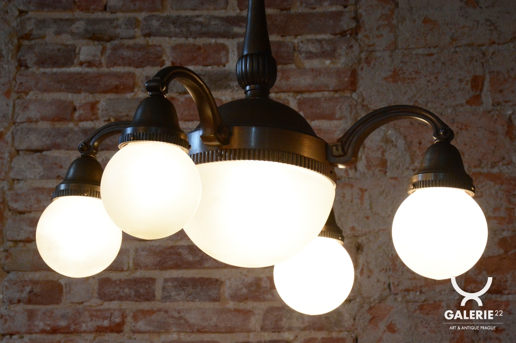 Tento impozantní salonní lustr je mistrovskou ukázkou československého designu období Art Deco a pochází z 20. let 20. století. Svítidlo zaujme svou velkorysou architektonickou formou a ušlechtilým materiálovým provedením. Konstrukce z patinované mosazi byla v rámci restaurování odborně vyčištěna, přičemž byla citlivě zachována její přirozená tmavší patina, která lustru dodává historickou hloubku a autentický charakter starožitnosti.