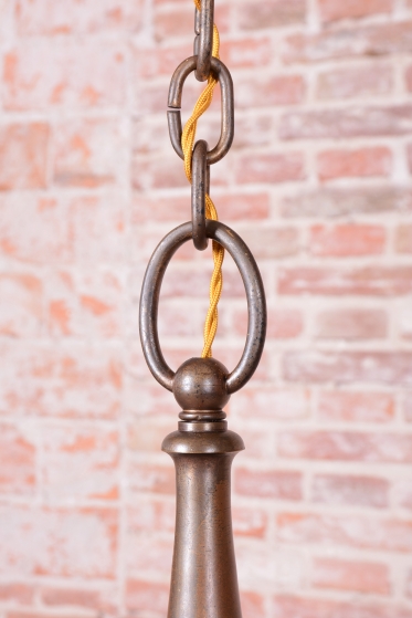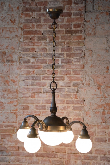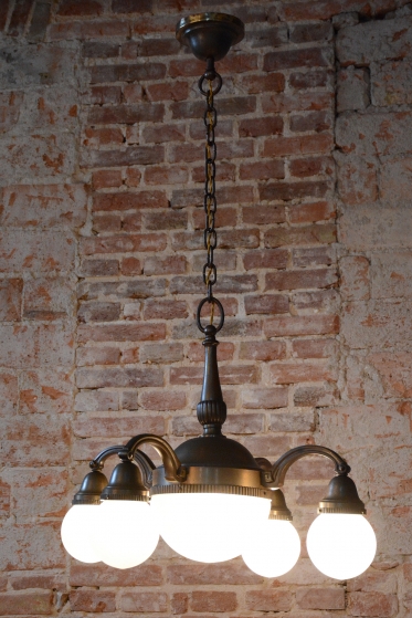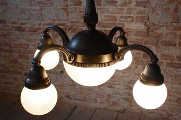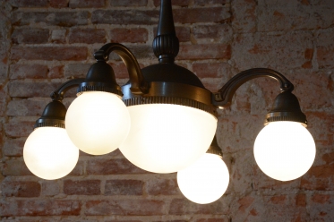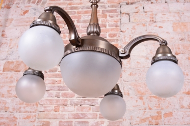 Dominantou lustru jsou stínidla z mléčného skla, která svým čistým bílým povrchem tvoří elegantní kontrast k tmavému kovu a zajišťují v interiéru měkké, příjemně rozptýlené světlo. Celý kus prošel kompletním restaurováním, které zahrnovalo i instalaci nové elektrifikace podle současných standardů. Tento lustr představuje dokonalé spojení luxusu první republiky a řemeslné poctivosti, díky čemuž se stane dominantním a plně funkčním prvkem každého reprezentativního salónu.
