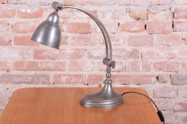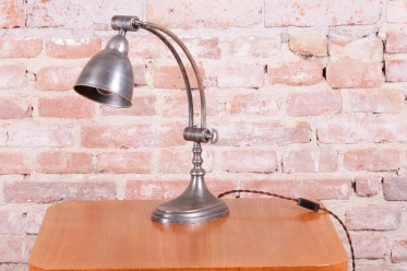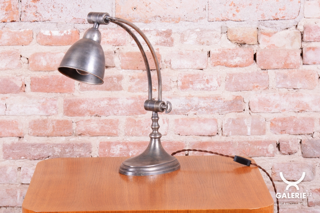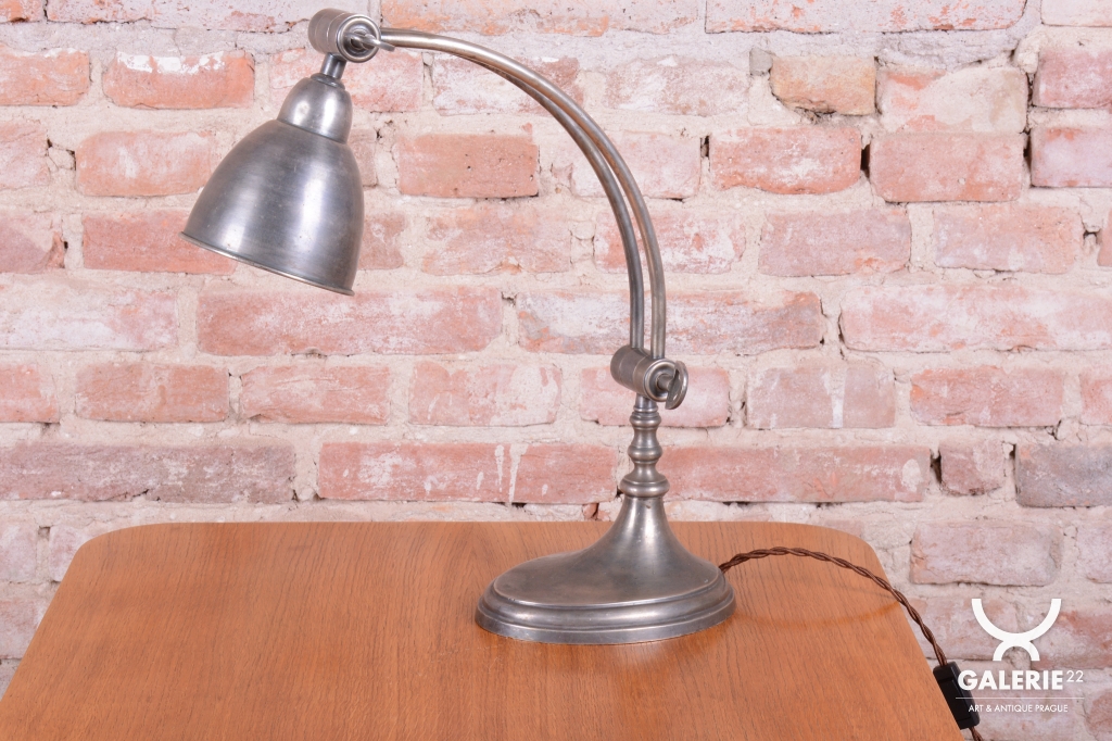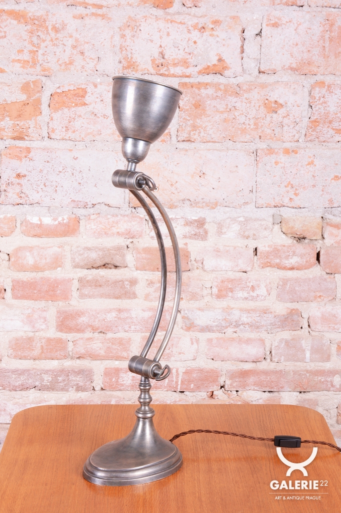 Tato elegantní stolní lampa představuje špičku francouzského designu období Art Deco a pochází z první poloviny 20. století. Je vyrobena z chromované oceli, která byla v rámci restaurování odborně ošetřena tak, aby si plně zachovala svou krásnou původní patinu. Právě tento autentický povrch dodává lampě nezaměnitelný charakter a historickou hloubku, která ji odlišuje od novodobých replik a podtrhuje její starožitnou hodnotu.