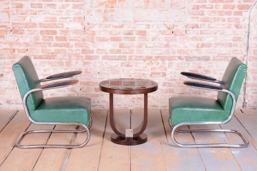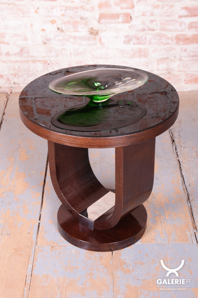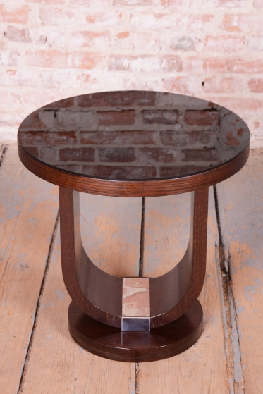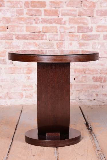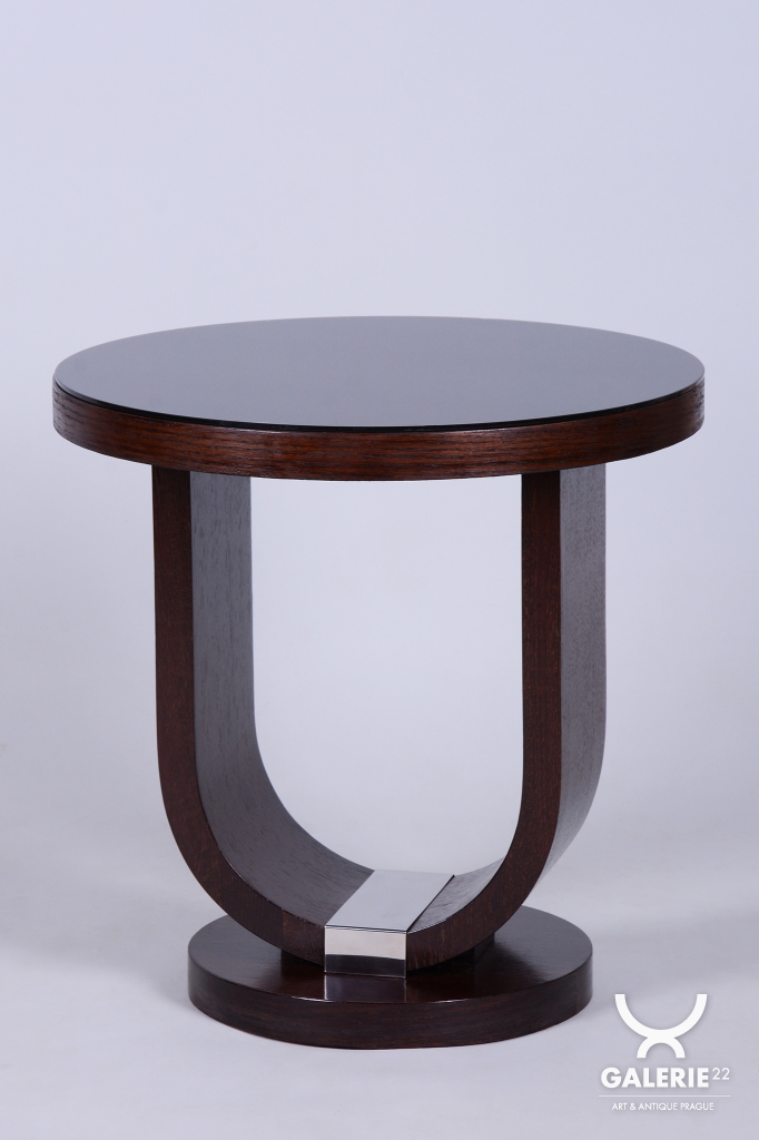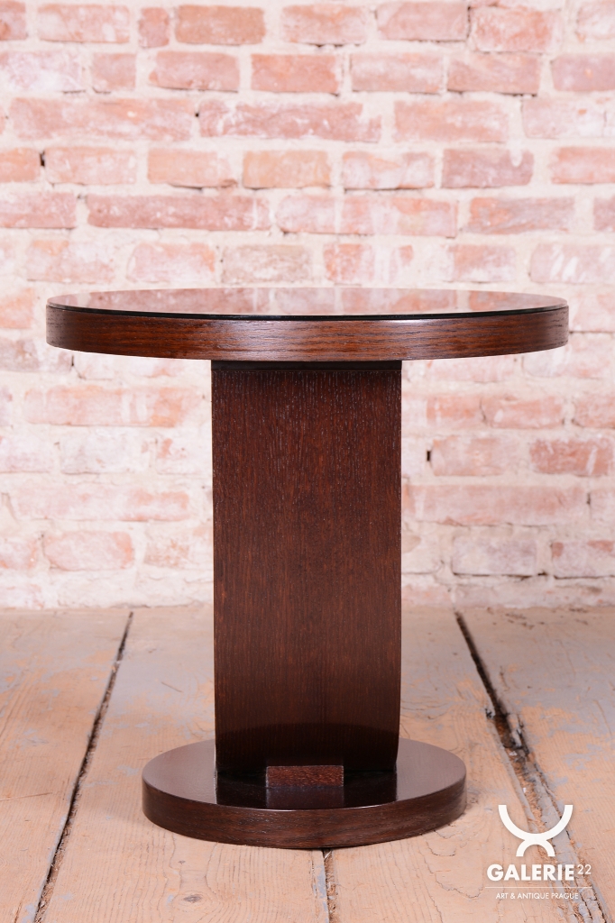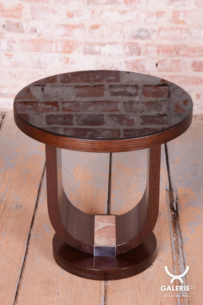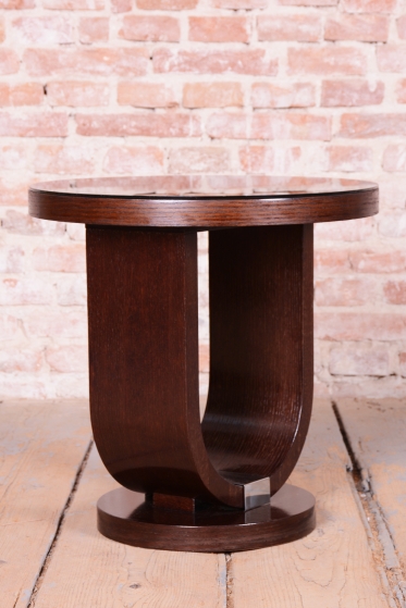 Tato exkluzivní ukázka francouzského nábytkového designu představuje vrcholné období stylu Art Deco a pochází z 20. let 20. století. Stolek zaujme svou unikátní architektonickou formou s podnožím ve tvaru písmene „U“, které spočívá na kruhové základně. Konstrukce je precizně dýhována dubem, jehož výrazná textura dodává předmětu hloubku a stabilitu. V rámci odborného restaurování byla citlivě oživená původní politura dřeva, díky čemuž vynikl přirozený tmavý odstín dubu.