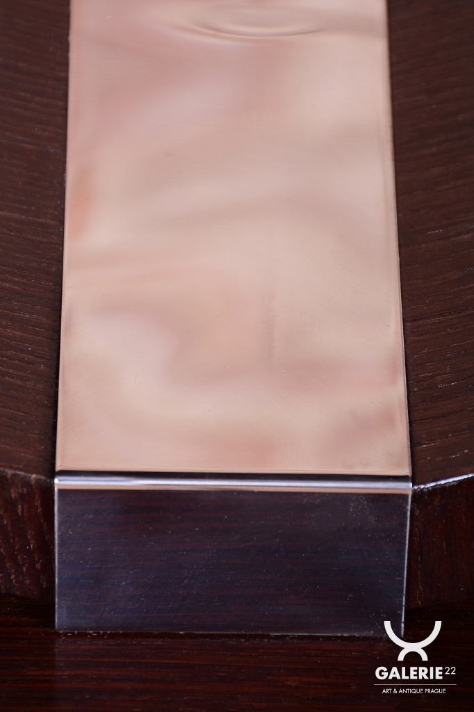Horní deska je osazena černým sklem, které vytváří dokonalý zrcadlový efekt a podtrhuje luxusní charakter celého kusu. Velmi zajímavým a dekorativním detailem je prvek ze stříbřeného plechu, který vizuálně propojuje spodní oblouk podnoží se základnou a vnáší do designu moderní kovový akcent. Celý stolek prošel komplexním restaurováním, je ve vynikajícím stavu a díky své nadčasové eleganci se stane výrazným solitérem v každém reprezentativním interiéru.