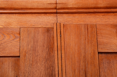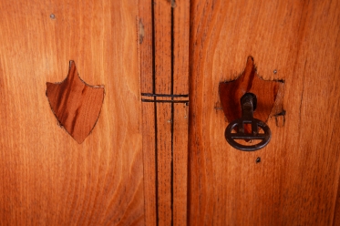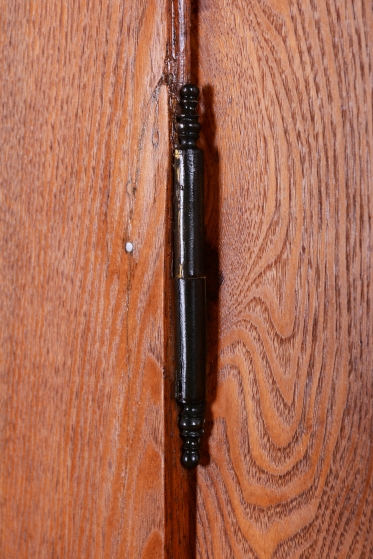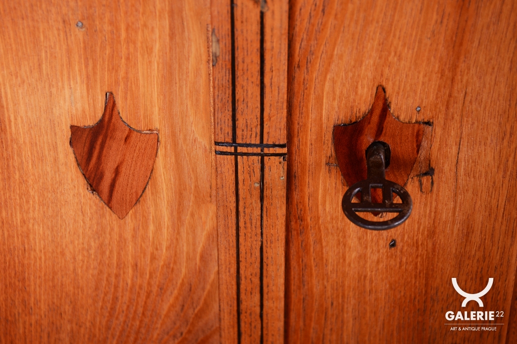 V rámci celkového procesu restaurování byla citlivě oživena původní politura dřeva, která jasanu navrátila jeho typický zlatavý medový odstín a hedvábný lesk. Pečlivá renovace se soustředila na zachování autenticity a historického charakteru, přičemž byla zdůrazněna krása přírodního materiálu v kontrastu s tmavou linkou ebenu. Skříň je osazena původním kováním a zámky, které podtrhují její sběratelskou hodnotu.