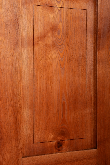 Tato monumentální klasicistní skříň představuje vrchol truhlářského umění v Čechách na začátku 19. století. Je vyrobena z jasanového masivu, který je v tomto období vysoce ceněn pro svou pevnost a nádhernou, výraznou kresbu dřeva. Čelní plochy dveří jsou zdobeny jemným ebenovým linkováním, které vytváří elegantní geometrické rámy a dodává celému kusu přísnou, ale noblesní klasicistní estetiku.