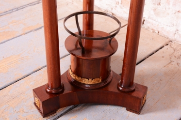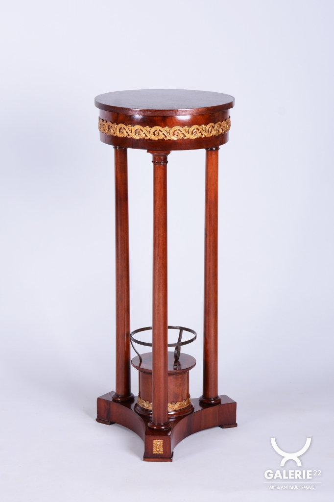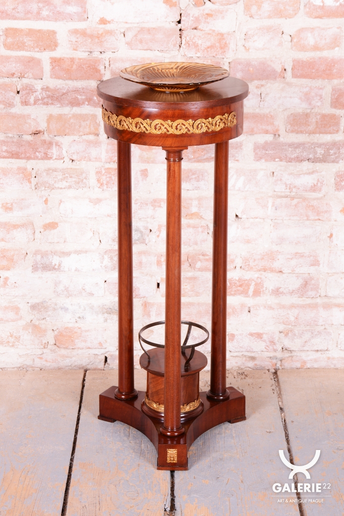 Tento exkluzivní empírový podstavec, který díky své konstrukci a proporcím najde skvělé využití také jako solitérní odkládací stolek, pochází z Francie z první poloviny 19. století. Předmět je vyroben z ušlechtilého mahagonového dřeva, které bylo v období empíru symbolem luxusu a vysokého společenského postavení. Celková kompozice spočívá na třech štíhlých sloupech, které vyrůstají z trojboké základny a nesou kruhovou desku, což je typické pro architekturu nábytku napoleonské éry.