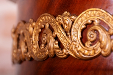 Výjimečnost tohoto kusu podtrhuje bohaté zdobení z leštěné mosazi. Horní lub podstavce je lemován precizně cizelovaným pásem s rostlinným motivem, který doplňují mosazné patky a hlavice sloupů. V rámci odborného restaurování byla citlivě oživena původní politura dřeva, která mahagonu navrátila jeho hluboký, temně červený odstín a sametový lesk. Kovové prvky byly rovněž vyčištěny, aby tvořily zářivý kontrast k tmavému masivu.
