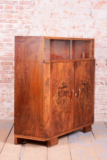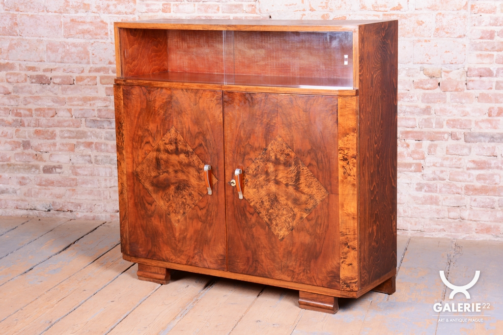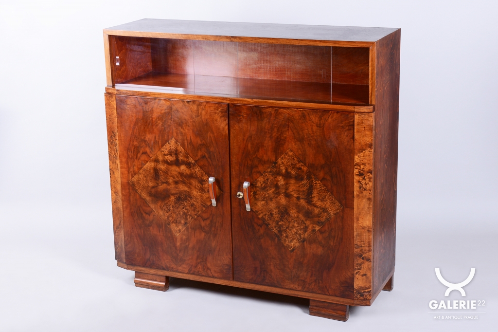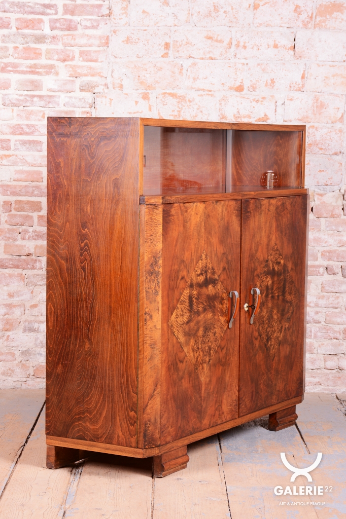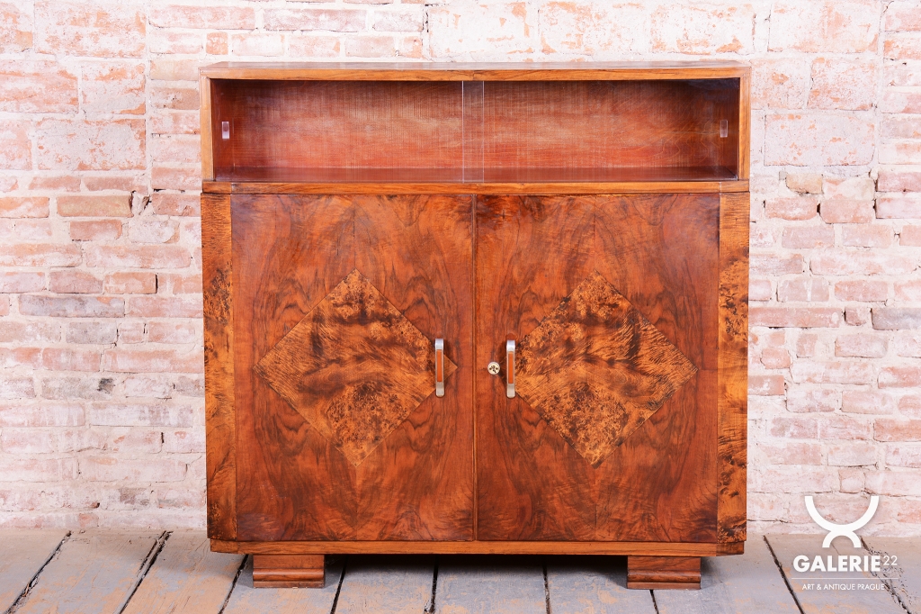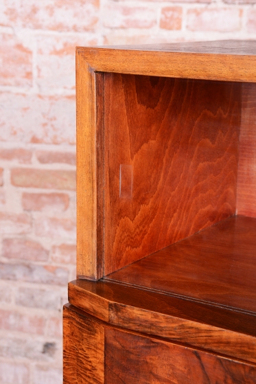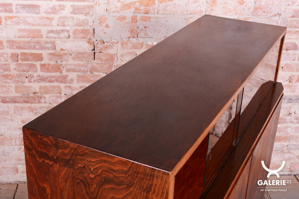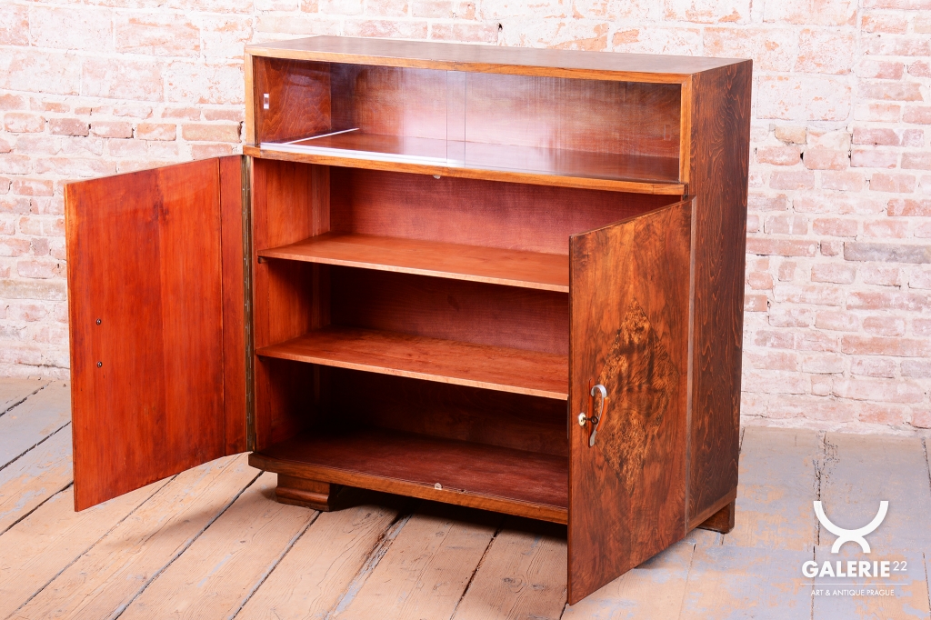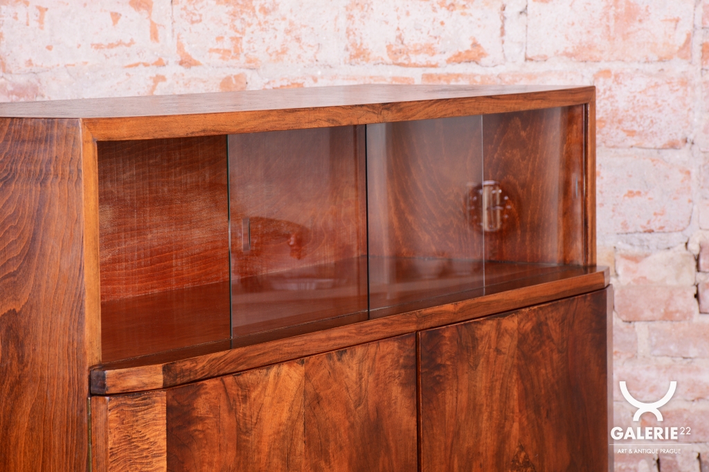 Horní část skříňky tvoří otevřený prostor s čirými šoupacími skly, který slouží k vystavení sběratelských předmětů nebo knih. V rámci odborného restaurování byla citlivě oživena původní politura dřeva, díky čemuž ořechová dýha i kořenice získaly zpět svou přirozenou hloubku, teplý odstín a hedvábný lesk. Původní madla s kovovými prvky ladí s celkovou estetikou a podtrhují autentický vzhled.