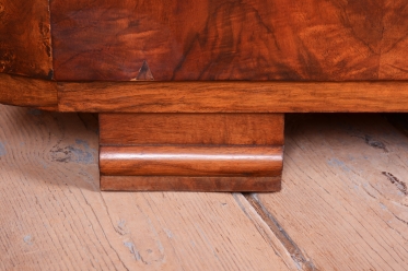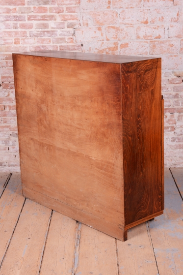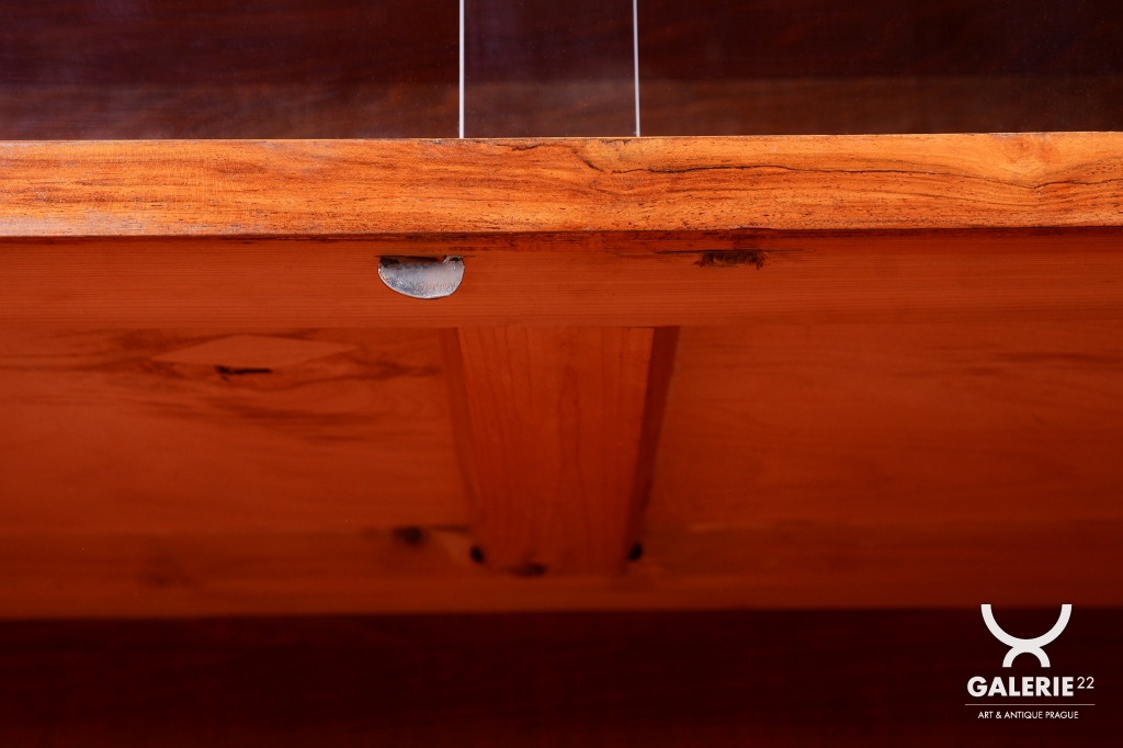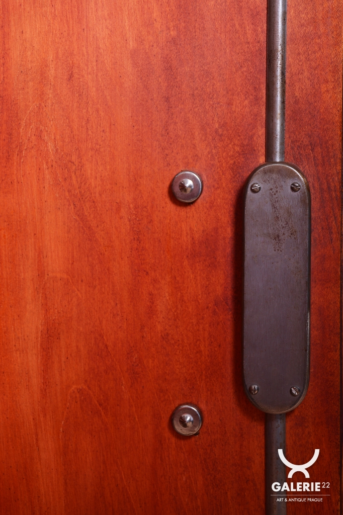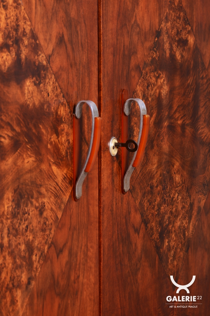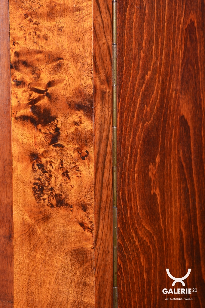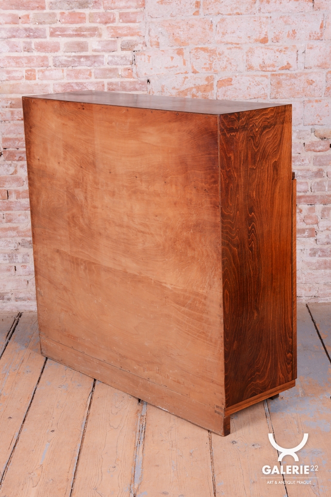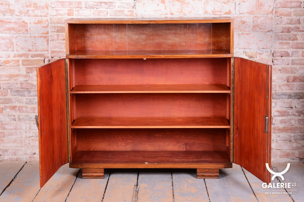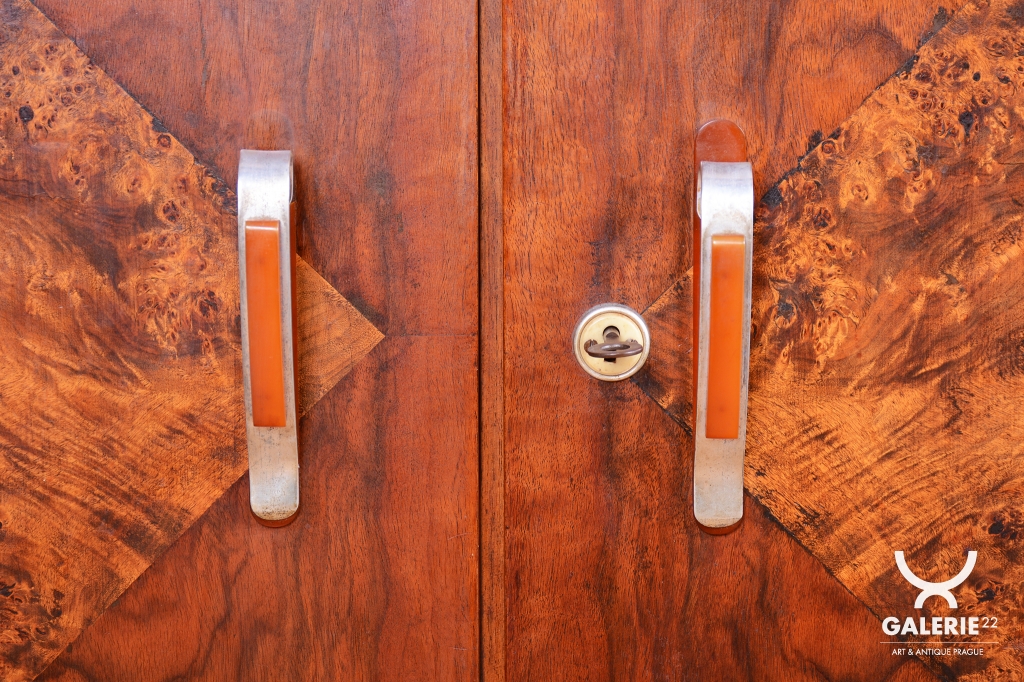 Horní část skříňky tvoří otevřený prostor s čirými šoupacími skly, který slouží k vystavení sběratelských předmětů nebo knih. V rámci odborného restaurování byla citlivě oživena původní politura dřeva, díky čemuž ořechová dýha i kořenice získaly zpět svou přirozenou hloubku, teplý odstín a hedvábný lesk. Původní madla s kovovými prvky ladí s celkovou estetikou a podtrhují autentický vzhled.