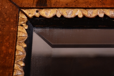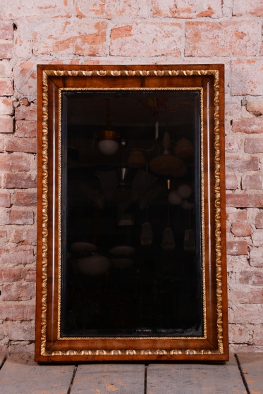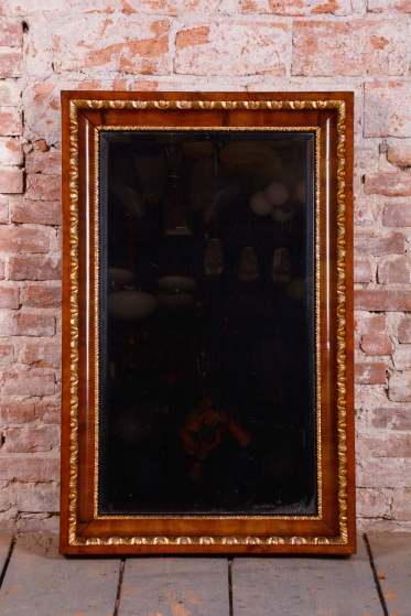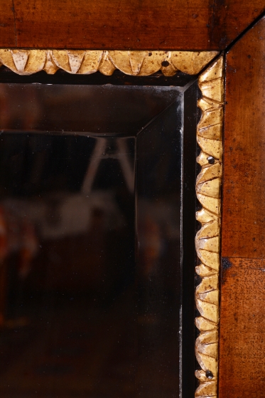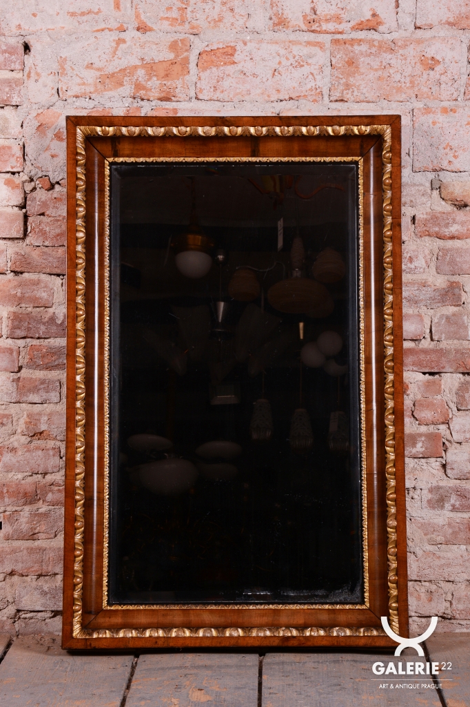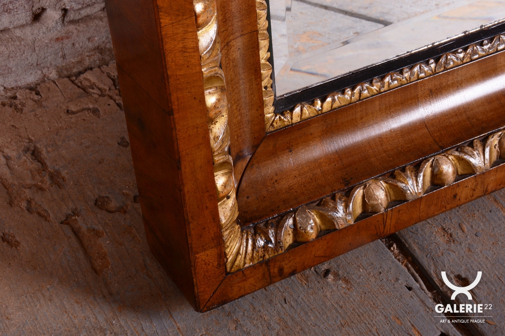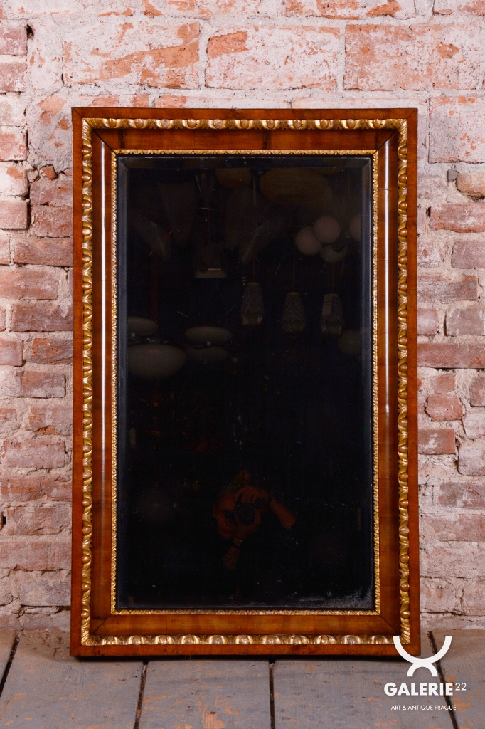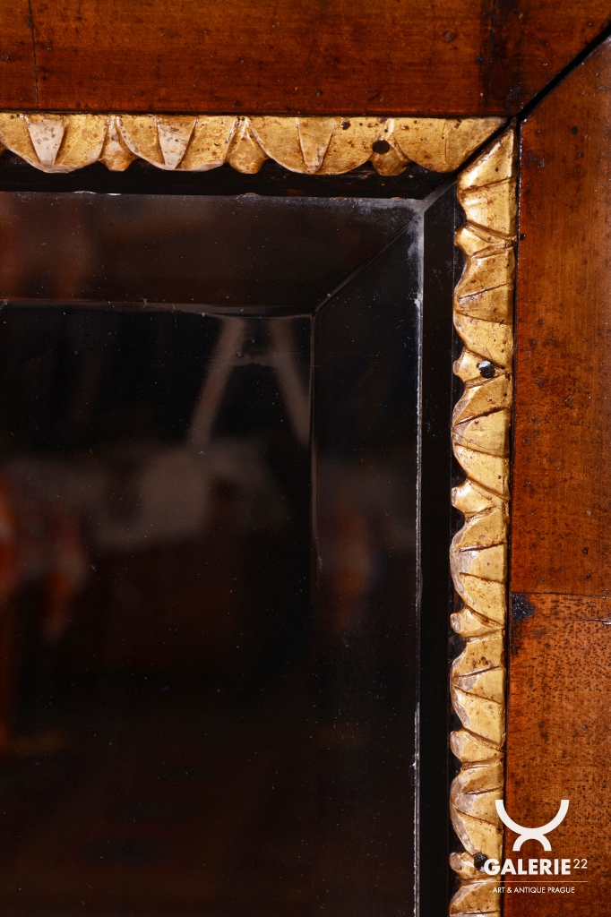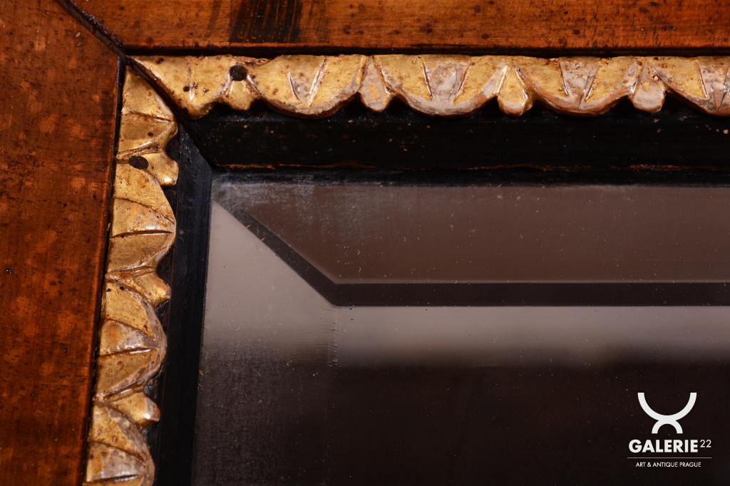 Mimořádnou dekorativní hodnotu zrcadlu dodávají řezbované zlacené lišty, které lemují vnitřní i vnější obvod rámu. Tyto jemné detaily v kombinaci s tmavým dřevem vytvářejí kontrast, který byl pro rakouský empír velmi typický. Velmi cenným prvkem je původní zrcadlo, které je opatřeno fazetou. Původní sklo po obvodu láme světlo a umocňuje luxusní vzhled i historickou autenticitu celého kusu. V rámci profesionálního restaurování byla citlivě oživená původní politura dřeva, což navrátilo rámu jeho hedvábný lesk a zvýraznilo kontrast se zlacenými prvky.
