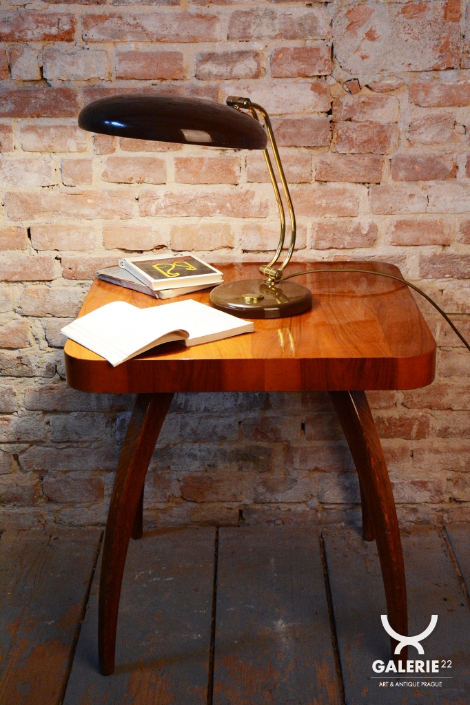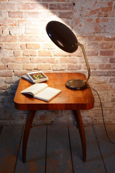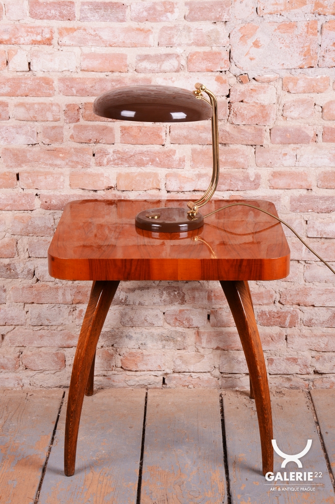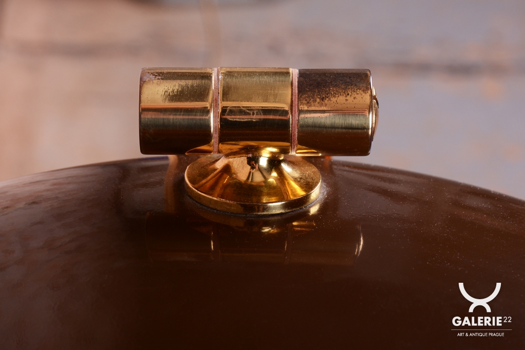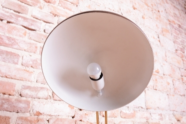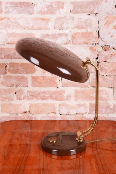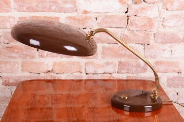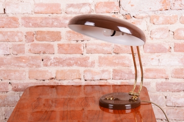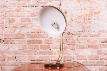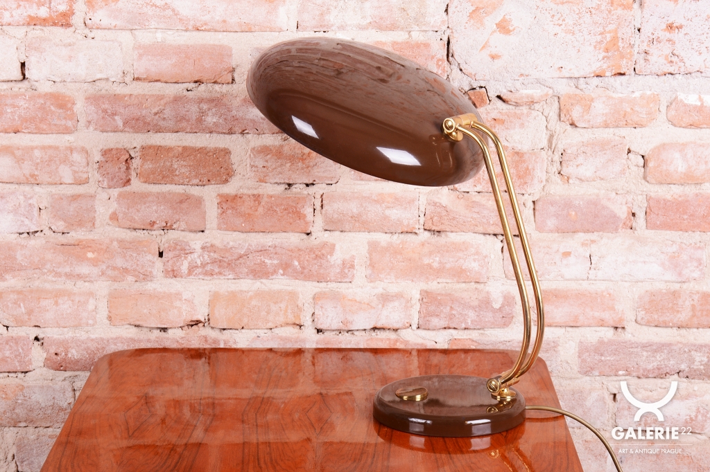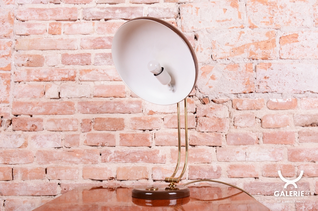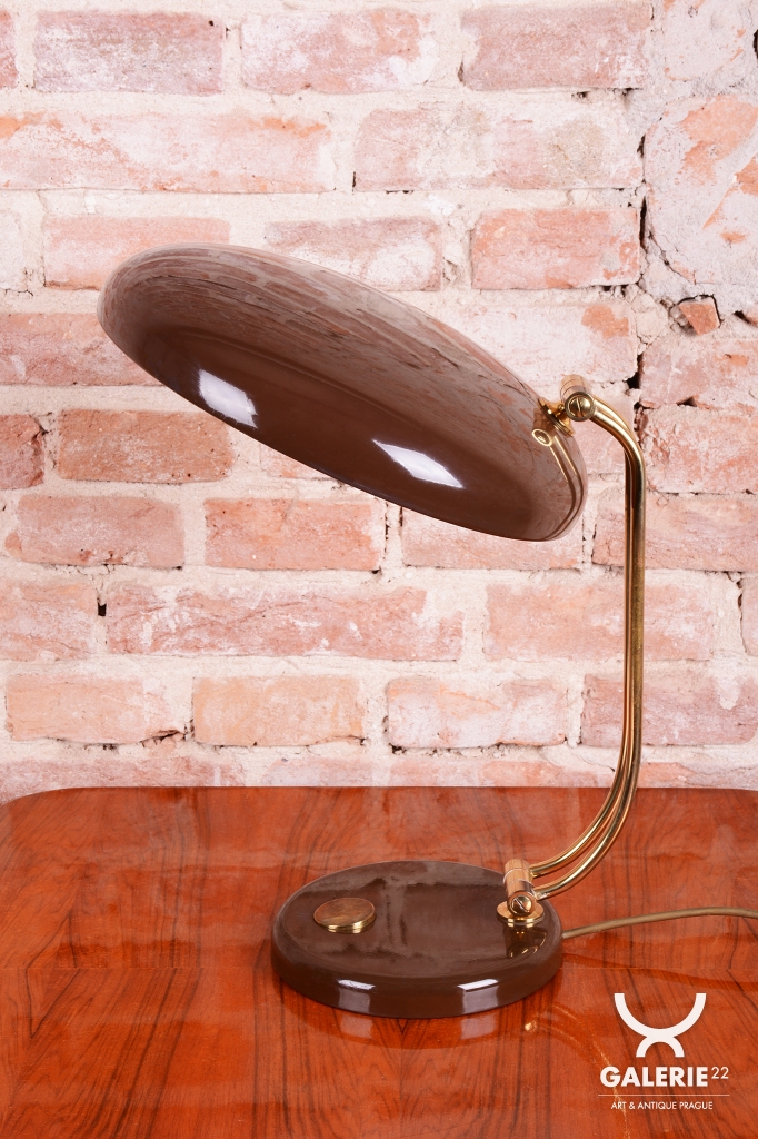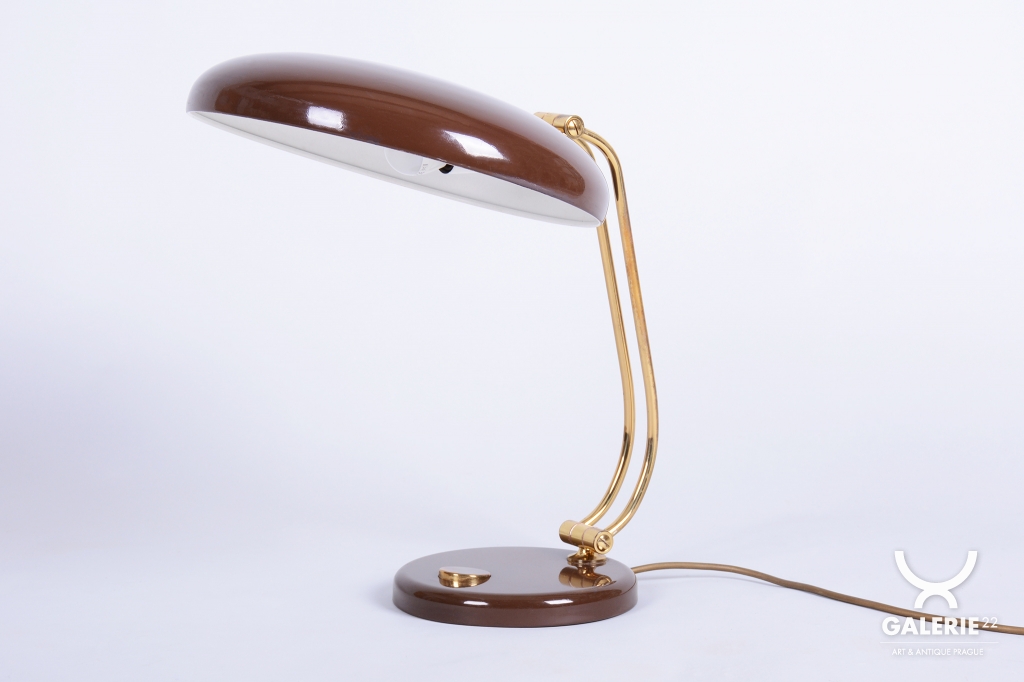 Tato stylová stolní lampa je vynikajícím příkladem poválečného modernismu v duchu Mid-Century designu. Byla navržena renomovaným architektem a designérem Egonem Hillebrandem v Německu v polovině 20. století. Svítidlo se vyznačuje ikonickou siluetou a precizním technickým zpracováním, které bylo pro značku Hillebrand typické. Konstrukce z kombinace smaltovaného kovu a mosazi prošla v rámci restaurování profesionálním vyčištěním, díky čemuž vyniká kontrast mezi sytým povrchem laku a hřejivým leskem mosazných prvků.