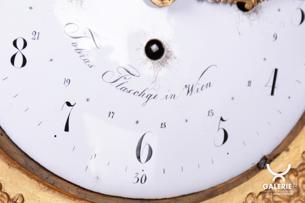 Signovány ciferník vídeňským hodinářem: Tobias Flaschge byl uznávaný vídeňský hodinářský, který se stal mistrem kolem roku 1817 a jeho dílna byla aktivní v první polovině 19. století. Rodina Flaschge patřila k tradičním hodinářským rodům.