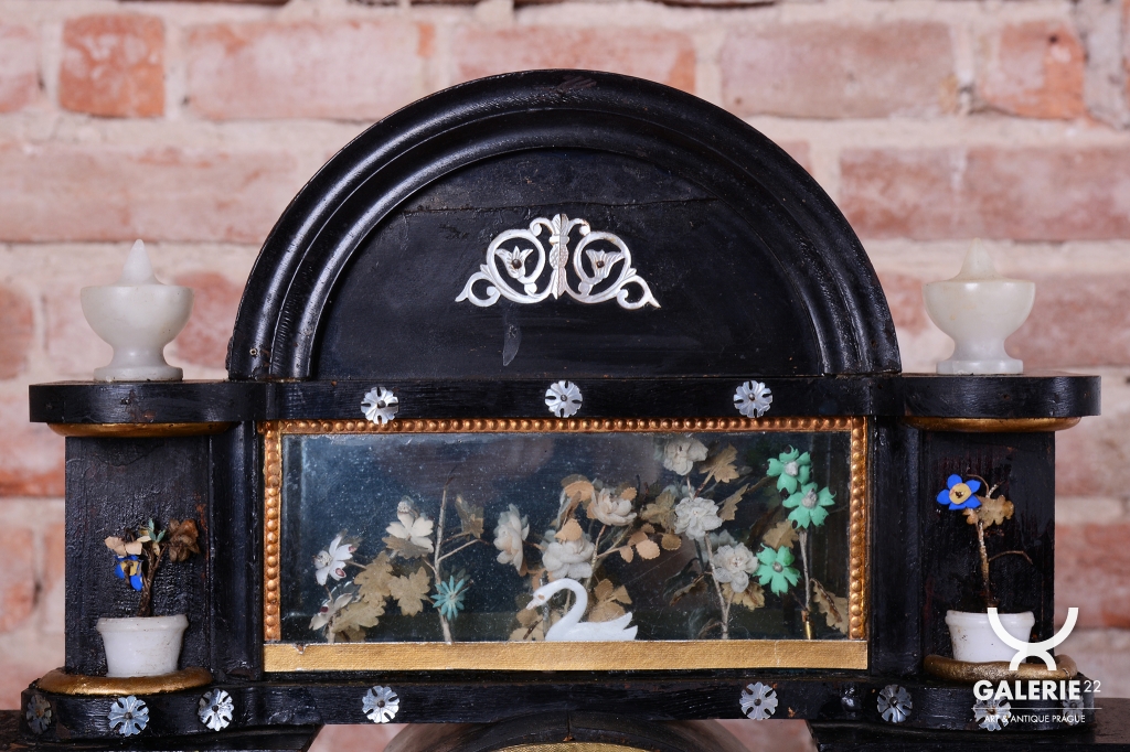 Ozdoby - perleť, alabastr a polychrom zlacené plátkovým zlatem.