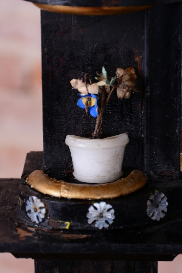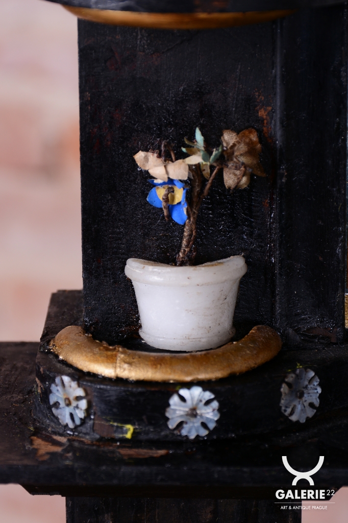 Rámeček uprostřed horní části (nad ciferníkem) je miniaturní diorama / scénka: Jedná se o malou dekorativní vitrínu, kde jsou umístěny drobné trojrozměrné dekorace (květiny, lístky, keře), často vyrobené z kusu mušle, vosku, hedvábí nebo papíru a případně dobarvené. Tento prvek slouží k rozptýlení a je typickým intimním dekoračním prvkem biedermeieru, který kladl důraz na domácí a citové hodnoty.