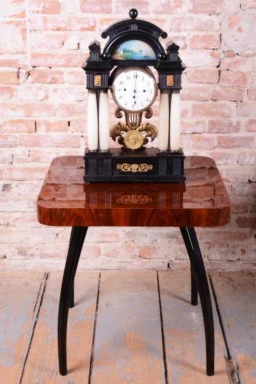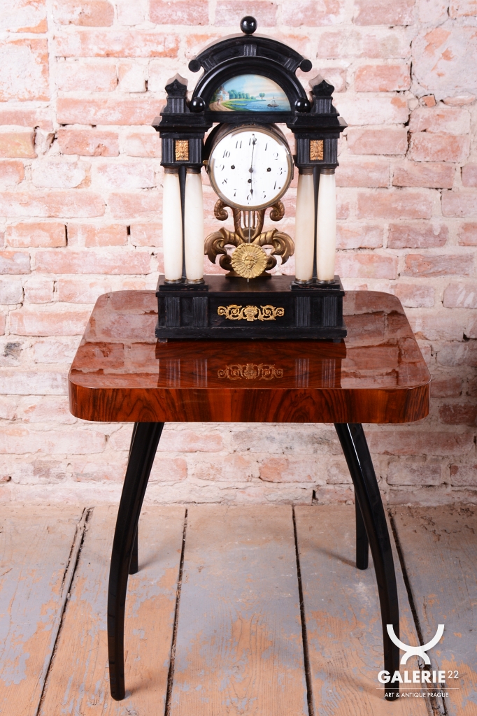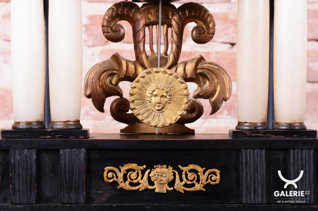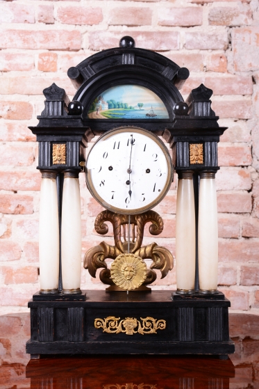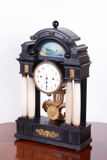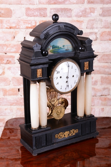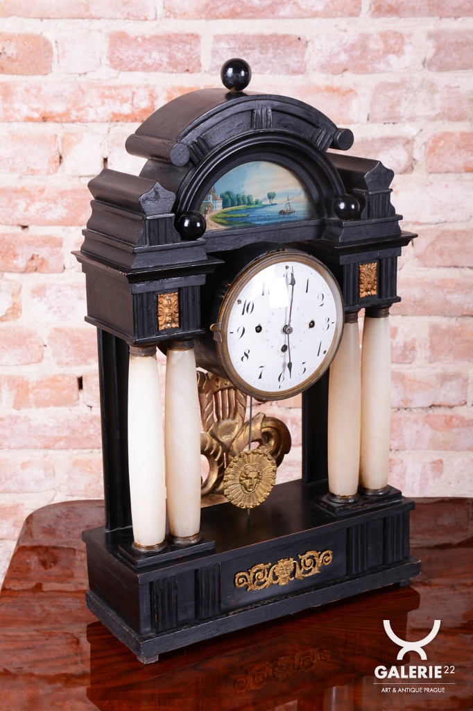 Celek vytváří dojem architektonického oltáře nebo chrámu, s nejvýraznějším dekorativním prvkem, kterým je miniaturní ruční malba, umístěná v horní části hodin.
