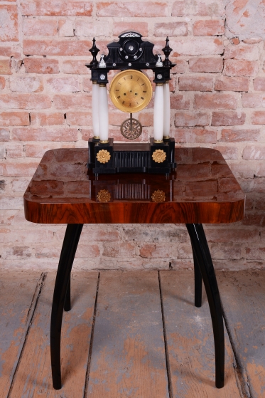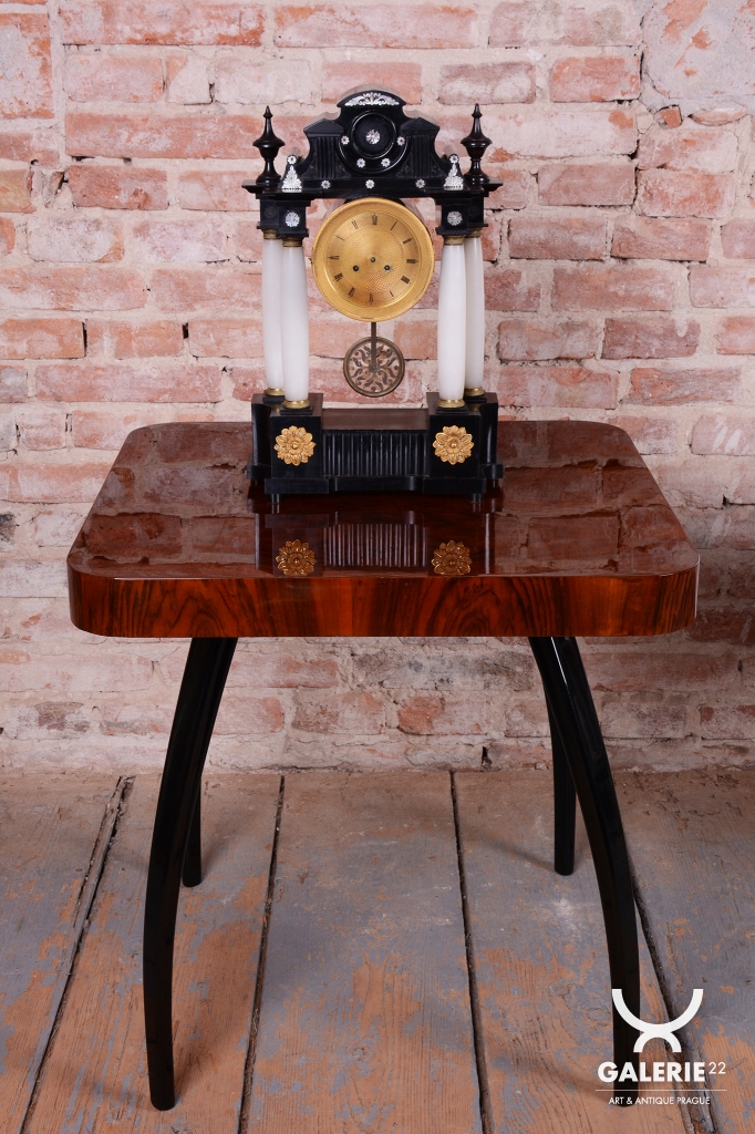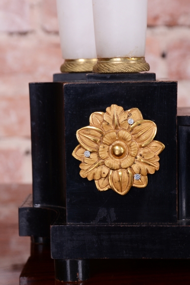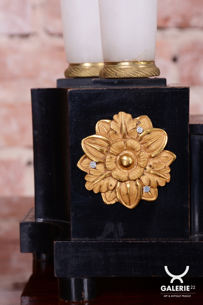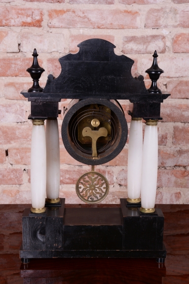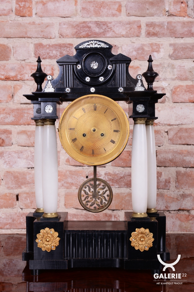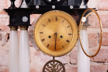 Pérové-natahují se klíčkem, chod 3-5 dní. Půlové bití (1/2) - bijí každých 30 min. Cizelovaný ciferník – mosaz. Sloupky z Alabastru. Cizelované mosazné ozdoby a perleť.