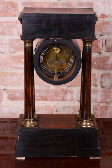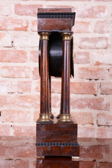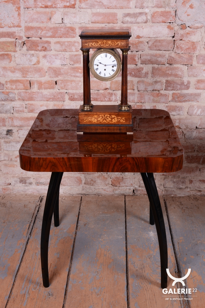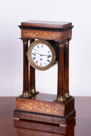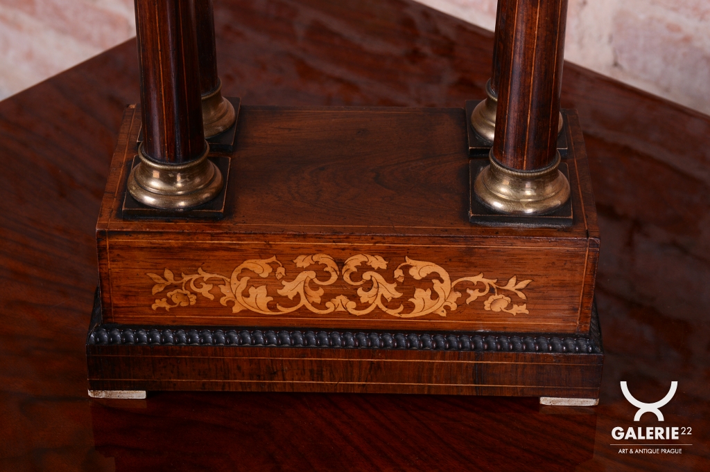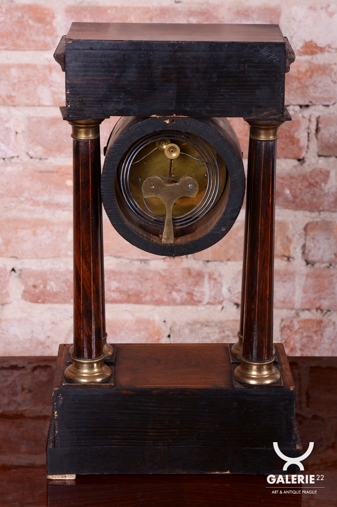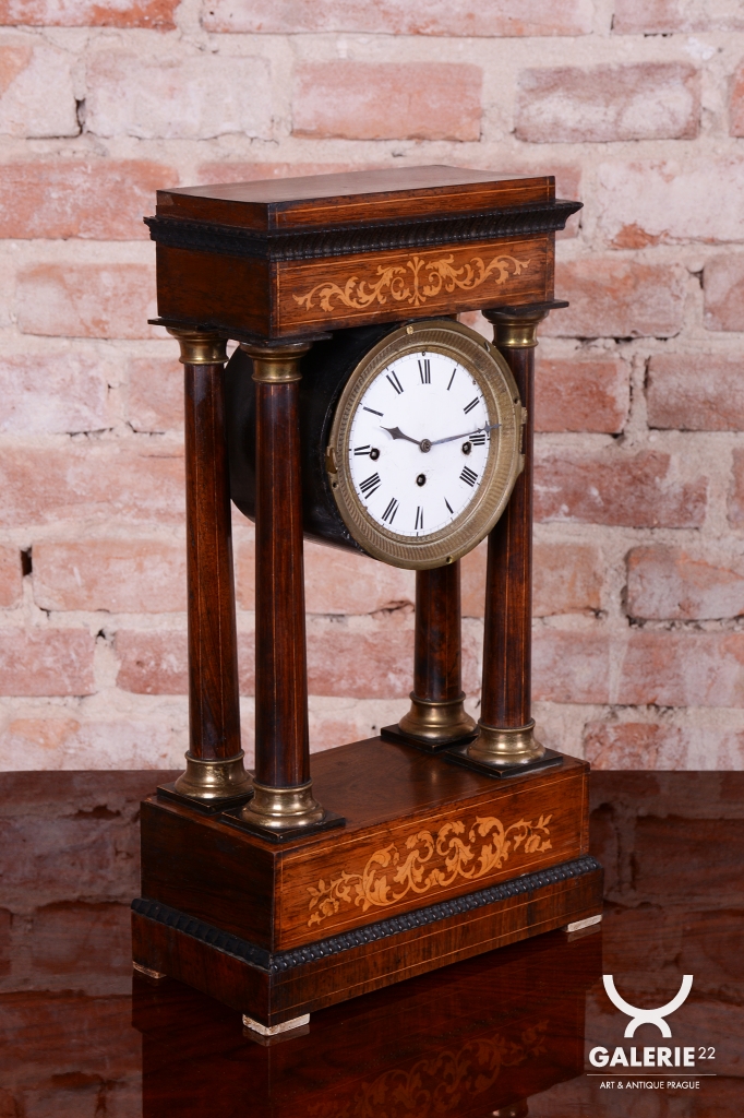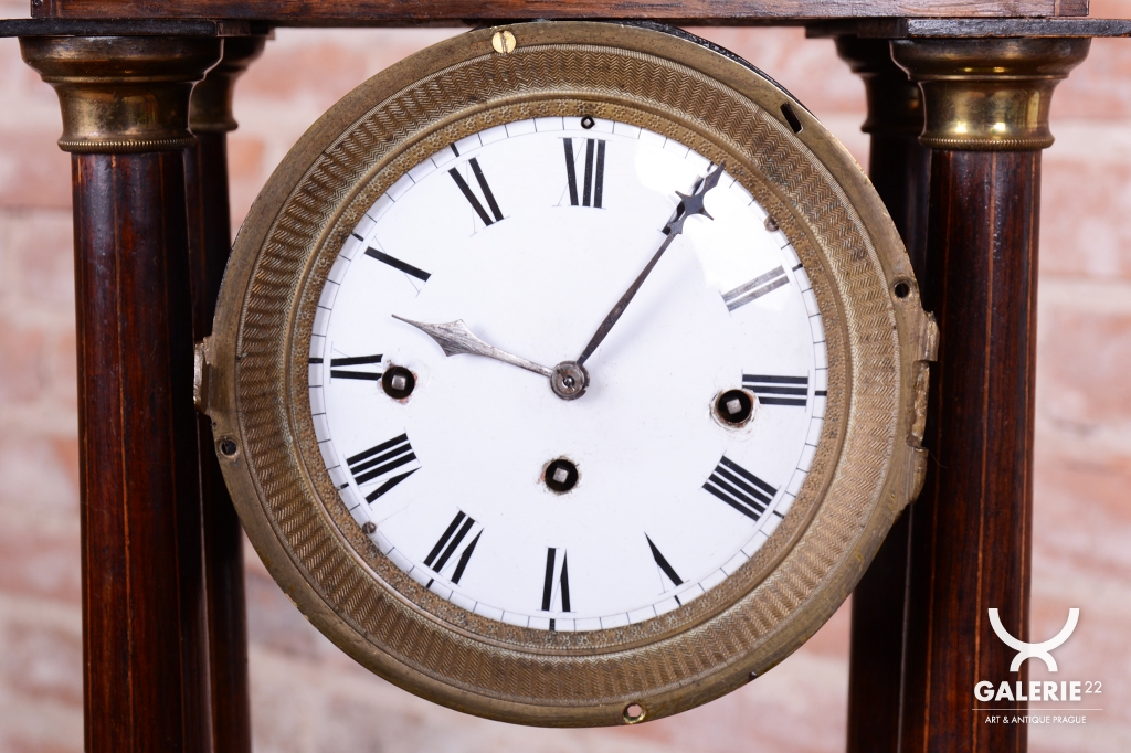 Pérové-natahují se klíčkem, chod 3-5 dní. Čtvrťové bití - 1/4 - bijí každých 15 min. Ciferník smalt. Věneček a patky sloupů - mosaz. Intarzovaná skříňka