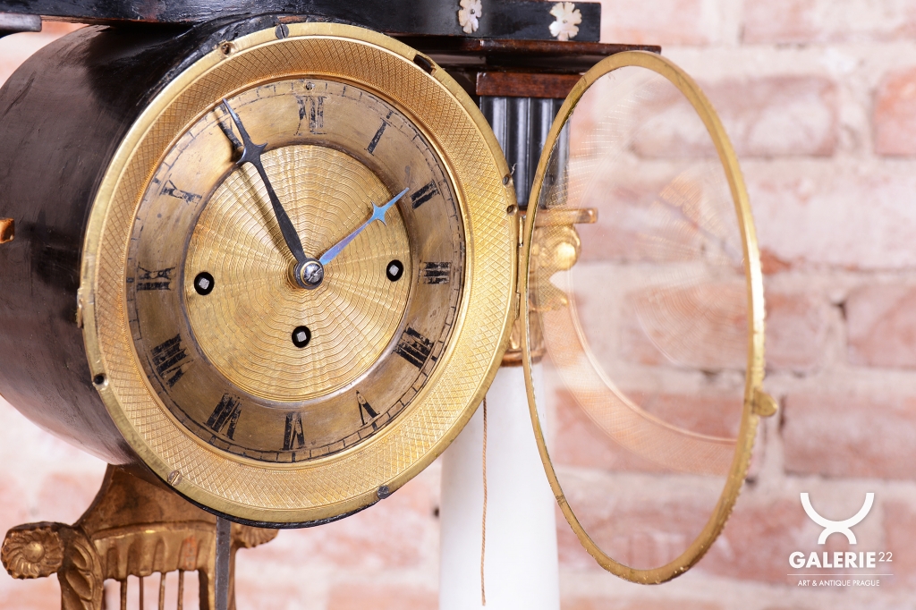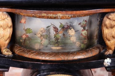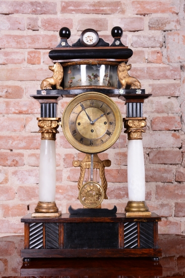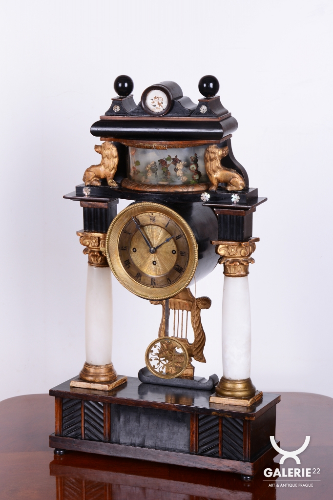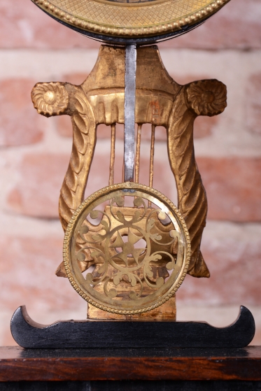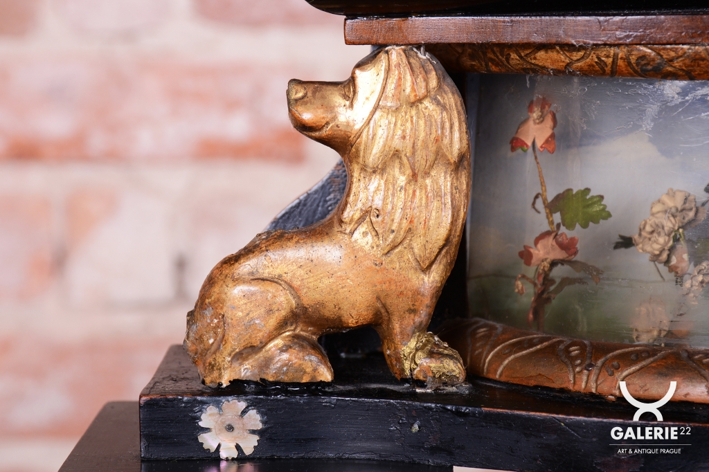 Rámeček uprostřed horní části (nad ciferníkem) je miniaturní diorama / scénka: Jedná se o malou dekorativní vitrínu, kde jsou umístěny drobné trojrozměrné dekorace (květiny, lístky, keře), často vyrobené z kusu mušle, vosku, hedvábí nebo dobarveného papíru. Tento prvek slouží k rozptýlení a je typickým dekoračním prvkem empíru, který kladl důraz na domácí a citové hodnoty. Stejně tak jako zlaté figurky lvů na horní římse, (symbol síly a moci) a zlacená lyra zavěšená pod ciferníkem nebo korintské hlavice - zdobné hlavice sloupů.