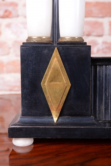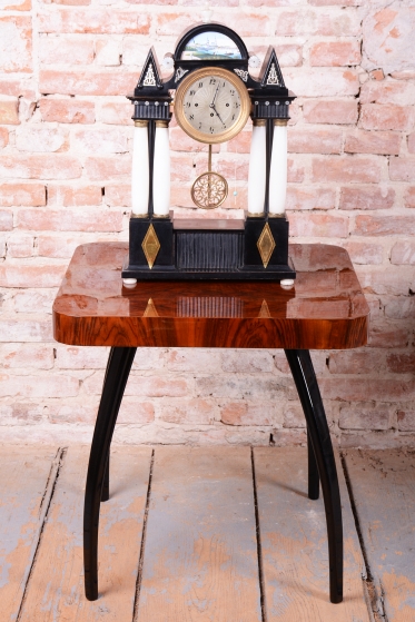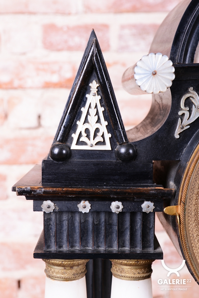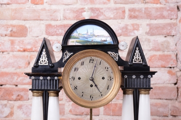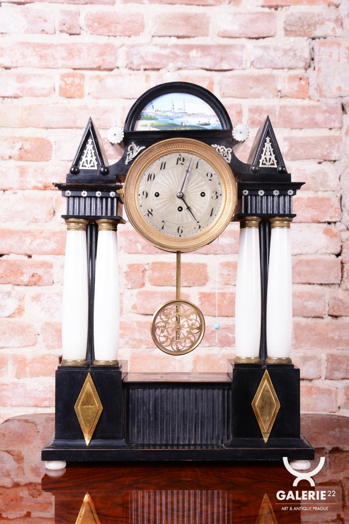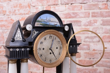 Celek vytváří dojem architektonického oltáře nebo chrámu, s nejvýraznějším dekorativním prvkem, kterým je miniaturní ruční malba, umístěná v horní části hodin.