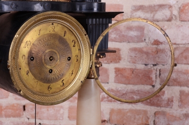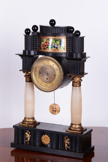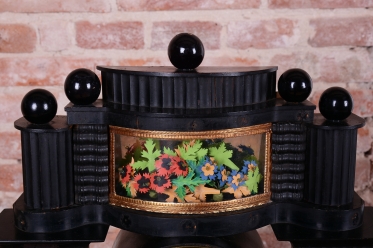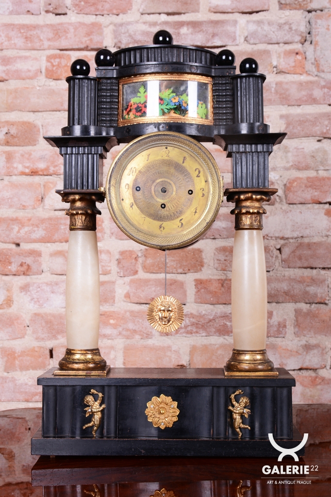 Rámeček uprostřed horní části (nad ciferníkem) je miniaturní diorama / scénka: Jedná se o malou dekorativní vitrínu, kde jsou umístěny drobné trojrozměrné dekorace (květiny, lístky, keře), často vyrobené z kusu mušle, vosku, hedvábí nebo dobarveného papíru. Tento prvek slouží k rozptýlení a je typickým dekoračním prvkem empíru, který kladl důraz na domácí a citové hodnoty. Stejně tak jako zlaté figurky andílků a slunce nebo korintské hlavice - zdobné hlavice sloupů.