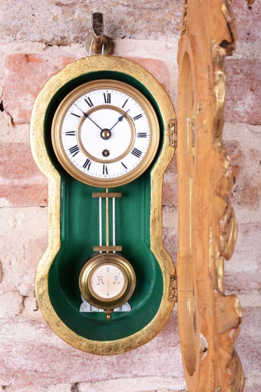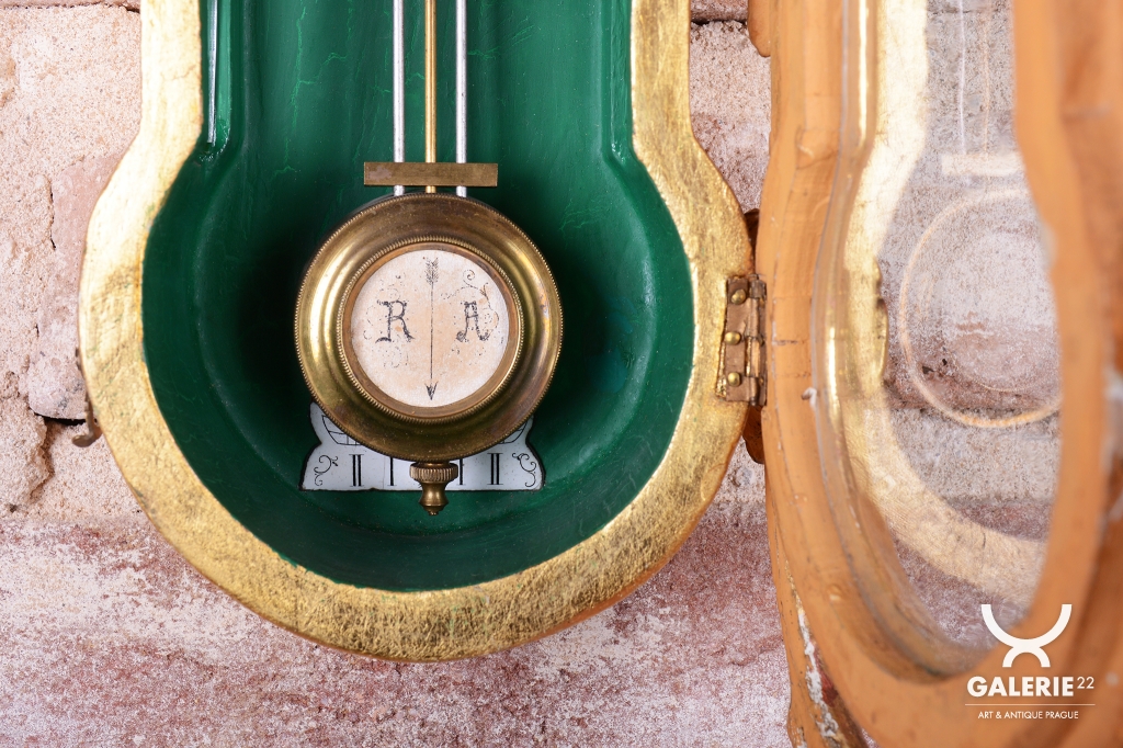 Ciferník a kyvadlo, kombinace smaltu a mosazi.