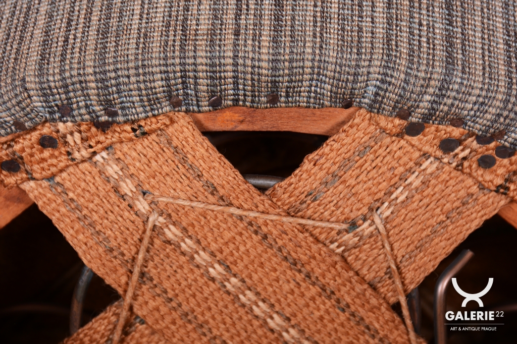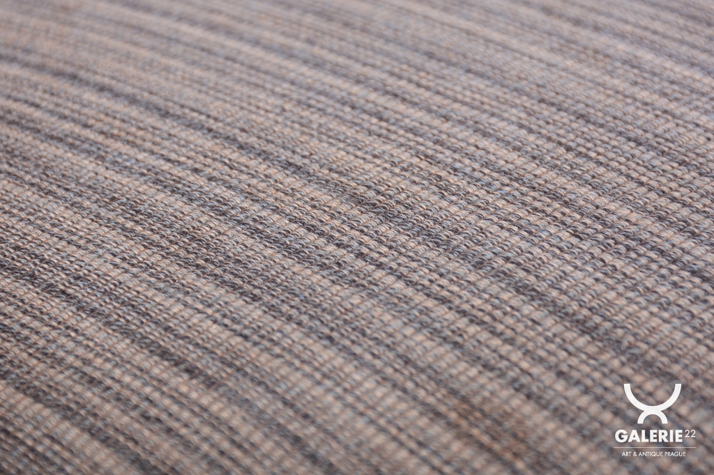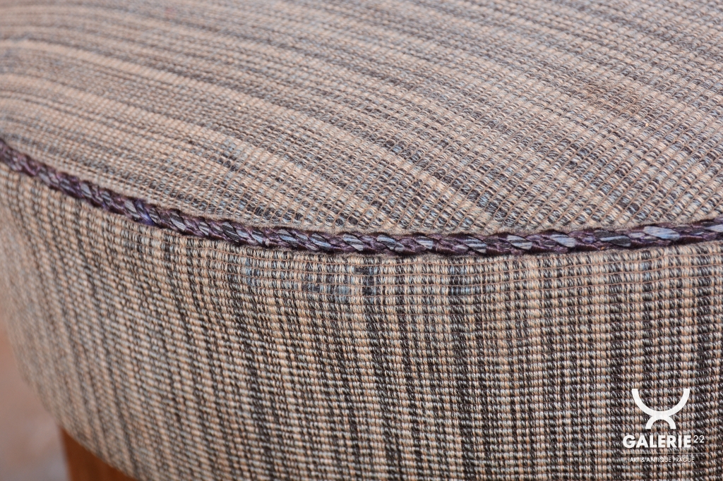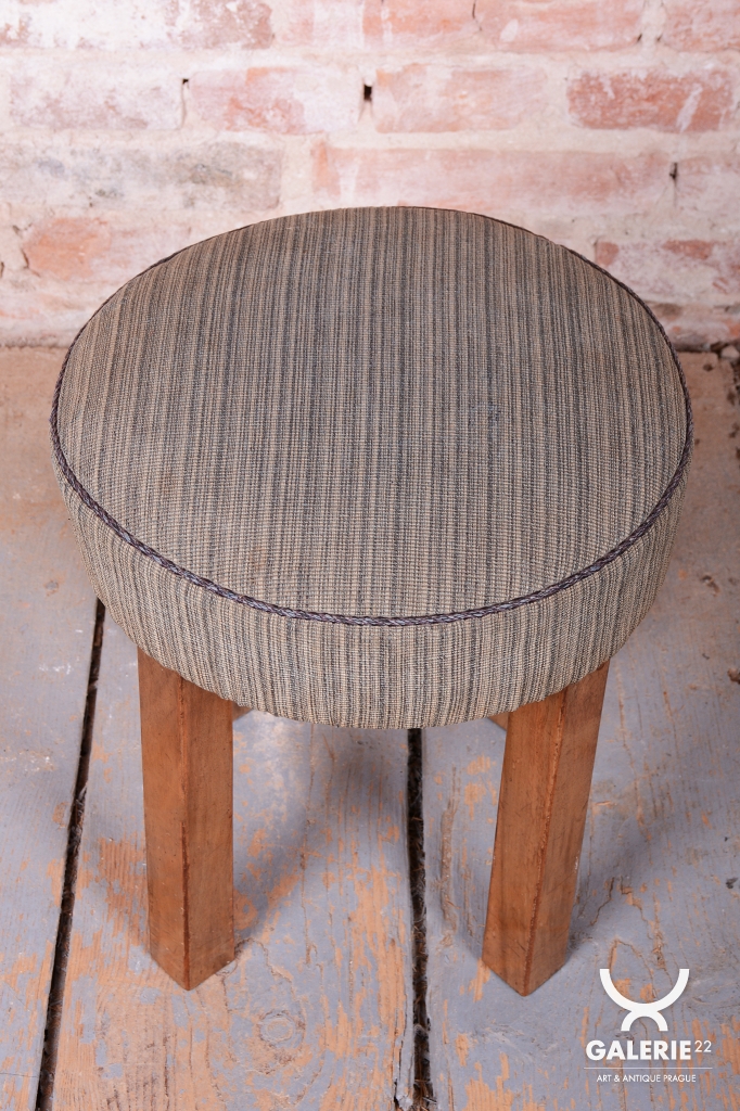 Tento elegantní taburet je krásnou ukázkou řemeslné zručnosti v Československu 20. let 20. století. Je postaven na stabilní a masivní konstrukci z ořechového dřeva, které se vyznačuje svou pevností a hlubokou, ušlechtilou barvou. V rámci odborného restaurování byla citlivě oživená původní politura, která dřevu vrátila jeho přirozený polomatný lesk a zdůraznila jeho jemnou kresbu.