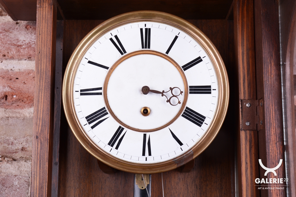 Týdenní stroj - tichý chod bez odbíjení. Jedno-závažové hodiny. Ciferník smalt. Rámeček a kyvadlo - mosaz.