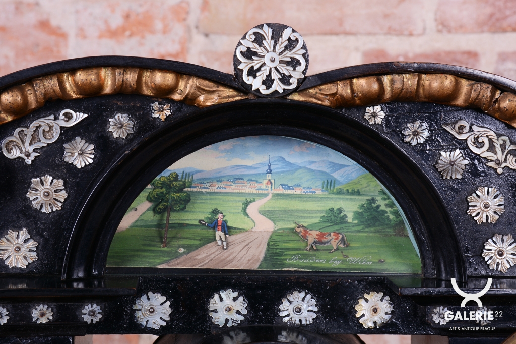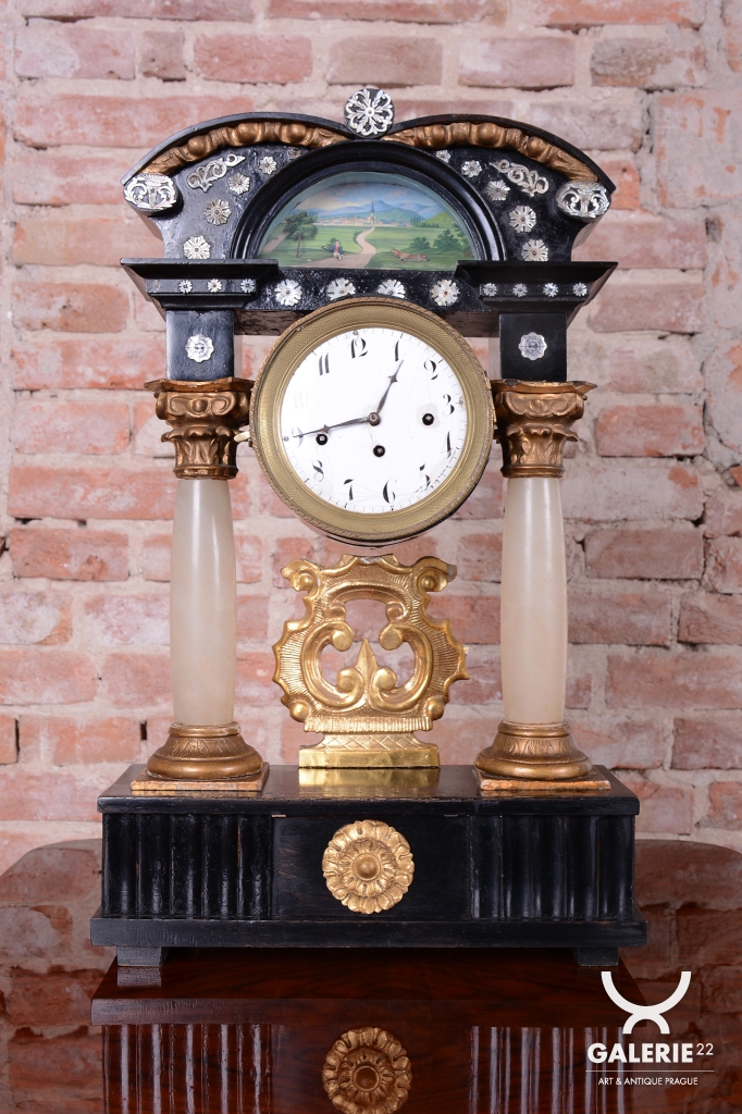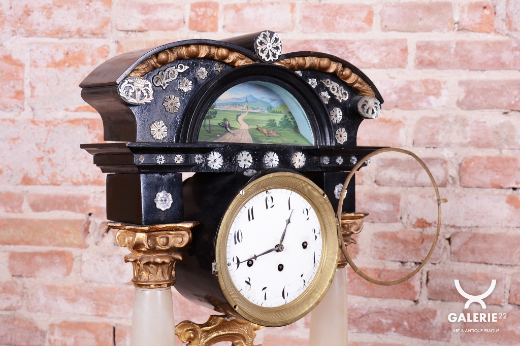 Celek vytváří dojem architektonického oltáře nebo chrámu, s nejvýraznějším dekorativním prvkem, kterým je miniaturní ruční malba, umístěná v horní části hodin.