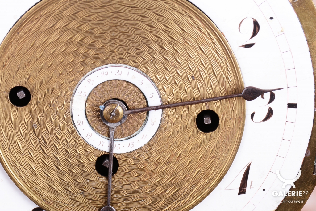 Mosazný rámeček a cizelovaný ciferník v kombinaci se smaltem.