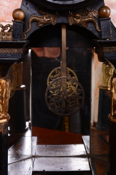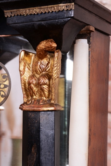 Přední sloupy - Karyatida: hodinová skříň je podepřena antickými sochami - polychrom - zlacené plátkovým zlatem.