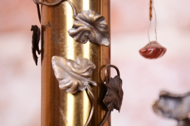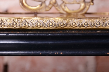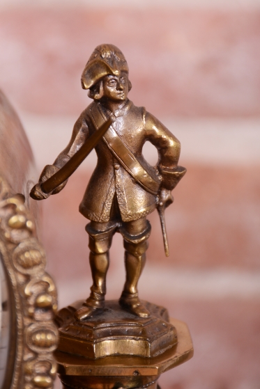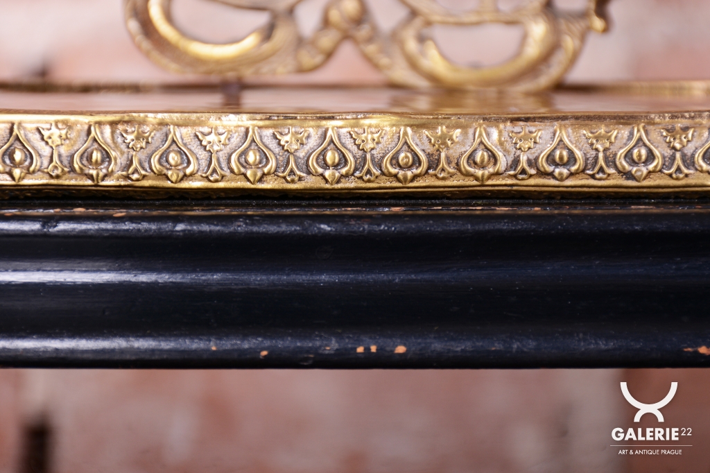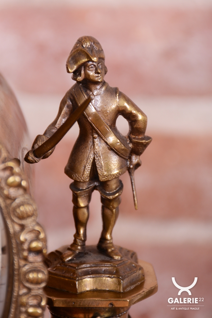 Celé tělo hodin je bohatě zdobeno v ohni zlacená mosaz.
