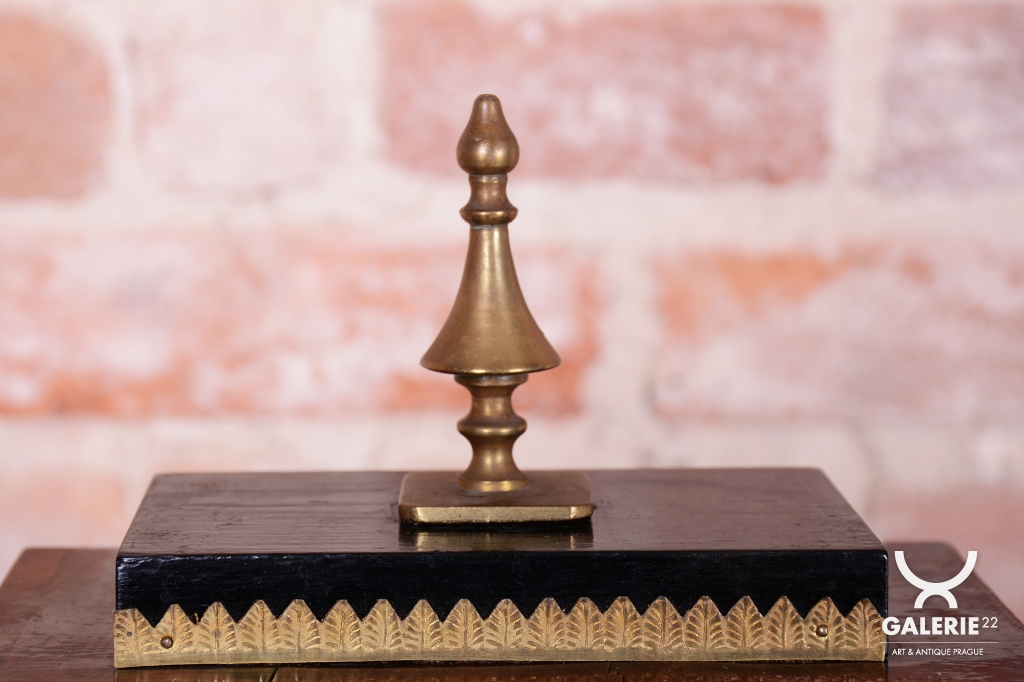 Cizelované mosazné ozdoby, kyvadlo a rámeček.
