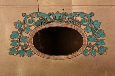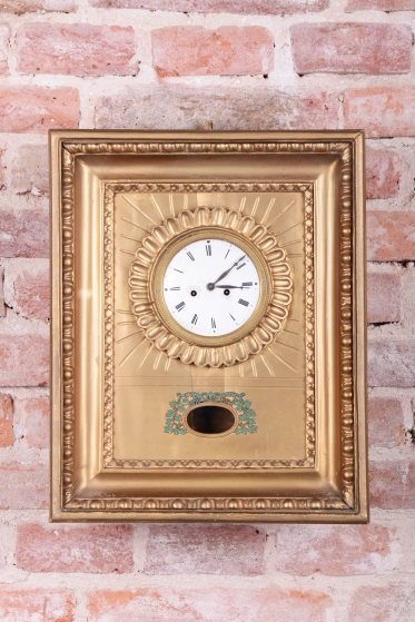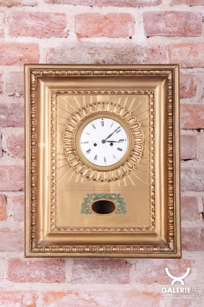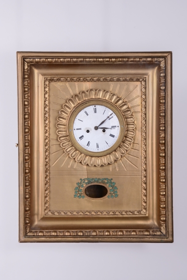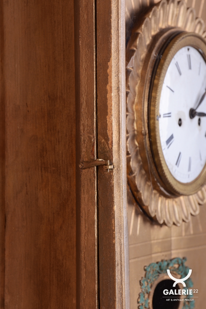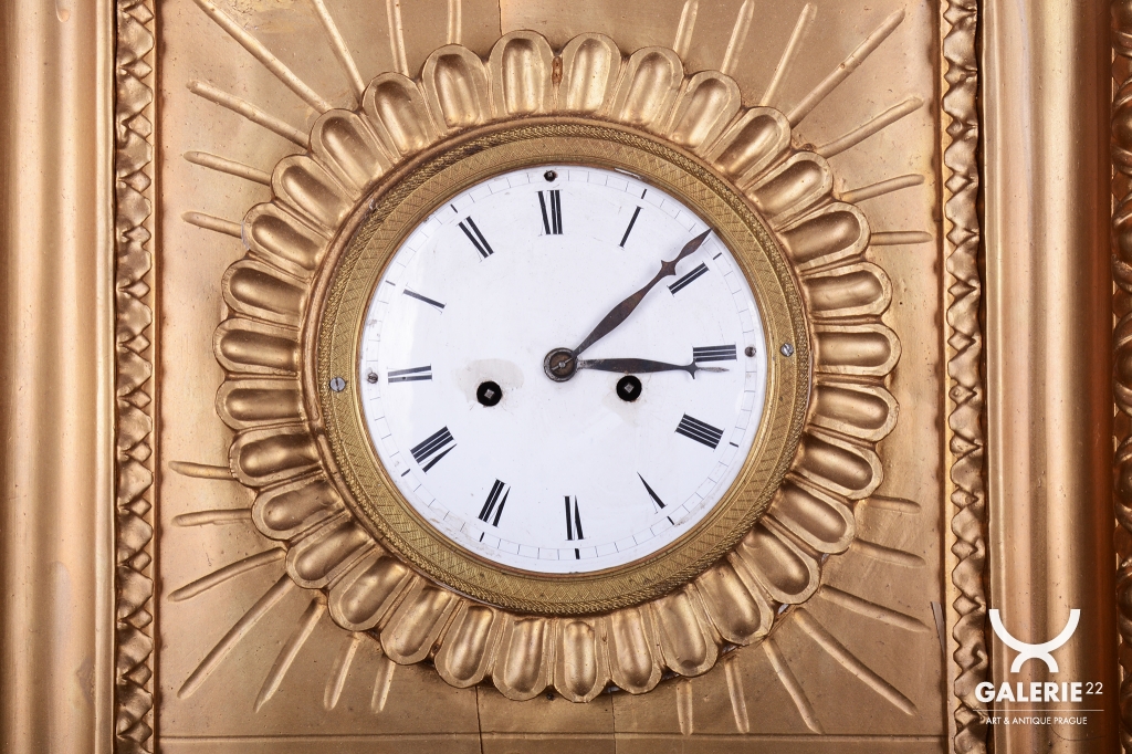 Věnec: Ciferník je vsazen do velkého, kruhového, bohatě reliéfního věnce ve tvaru slunce,(slunce jako symbol monarchie/síly).