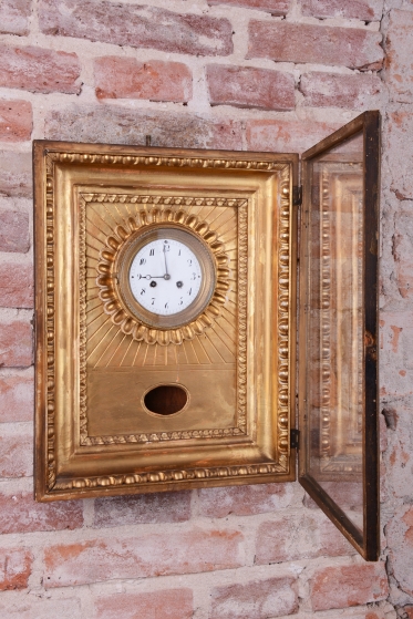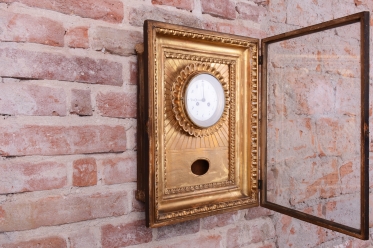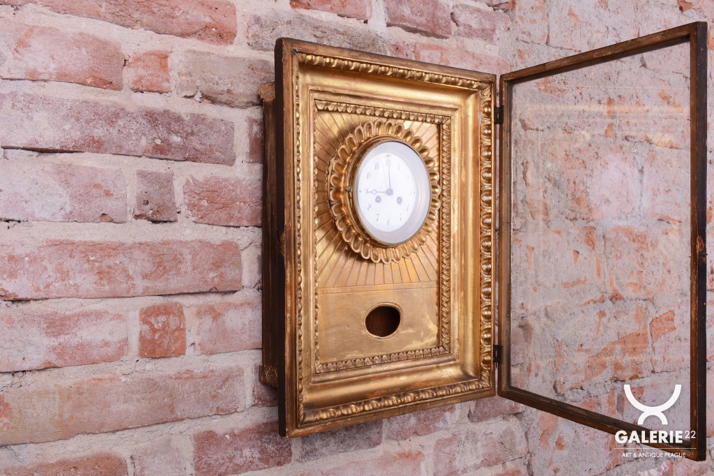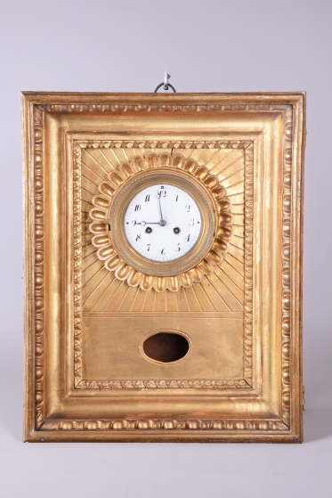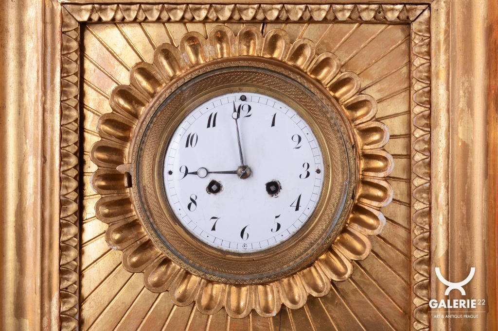 Věnec: Ciferník je vsazen do velkého, kruhového, bohatě reliéfního věnce ve tvaru slunce, (slunce jako symbol monarchie/síly).