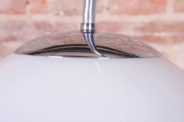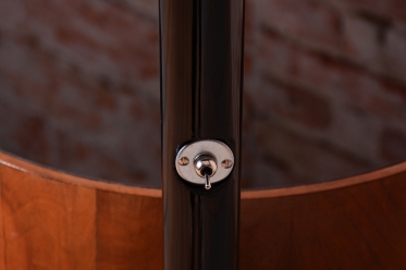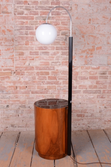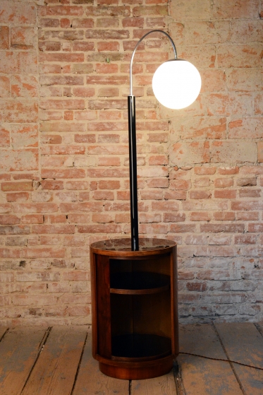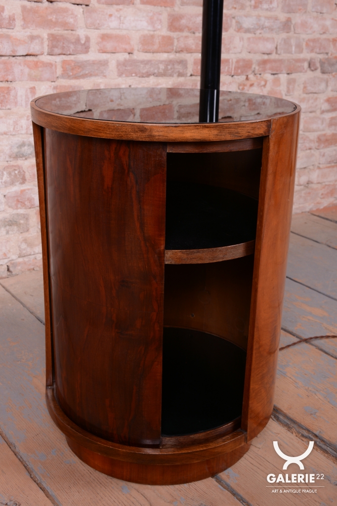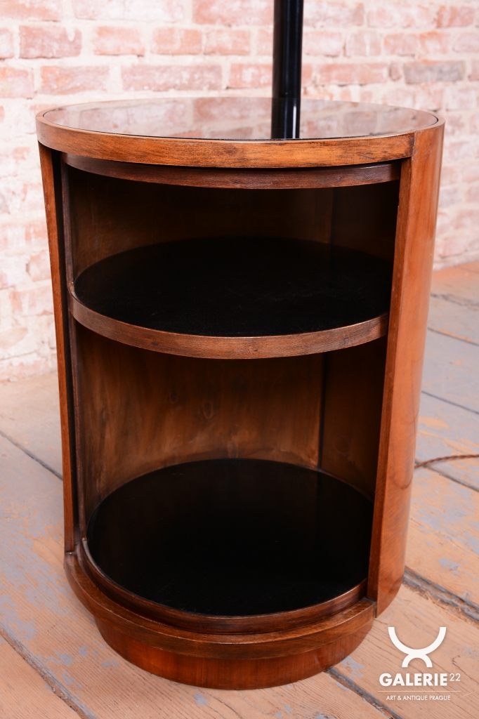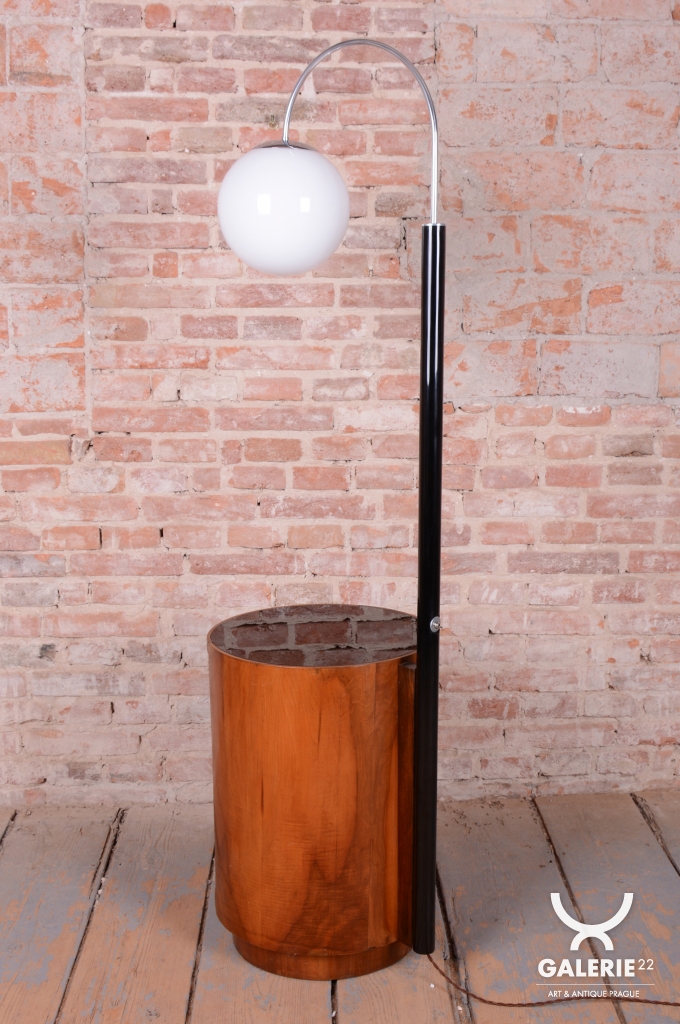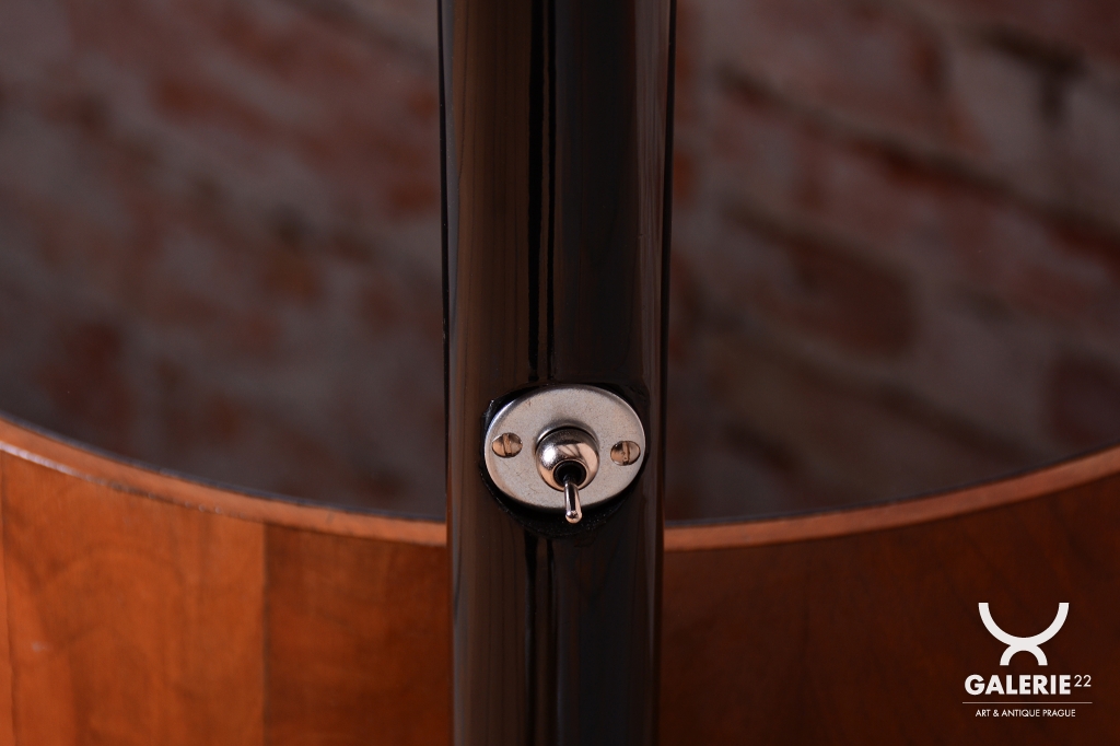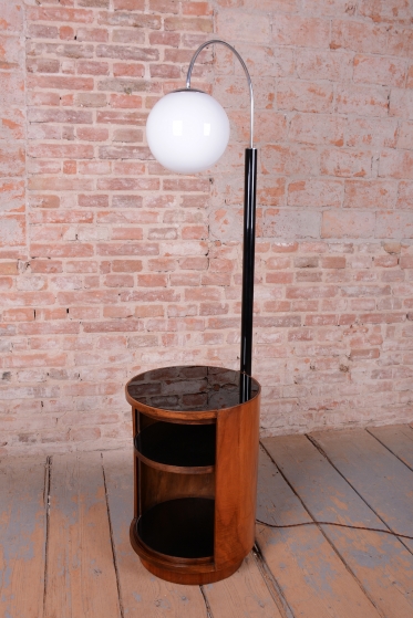 Předmět prošel kompletním restaurováním. Základnu tvoří úložná skříňka ve tvaru válce s unikátním otočným mechanismem zasouvání a vysouvání dvířek. Povrch skříňky o výšce 65 cm je dýhován bohatou ořechovou dýhou s oživenou původní politurou. Vrchní deska válce je osazena černým sklem, které slouží jako elegantní odkládací plocha. Subtilní rameno lampy z trubkové chromované oceli bylo profesionálně vyčištěno a osazeno stínidlem z opálového skla o průměru 25 cm. Lampa má novou elektrifikaci s dobově autentickým hnědým opleteným kabelem a je plně funkční.