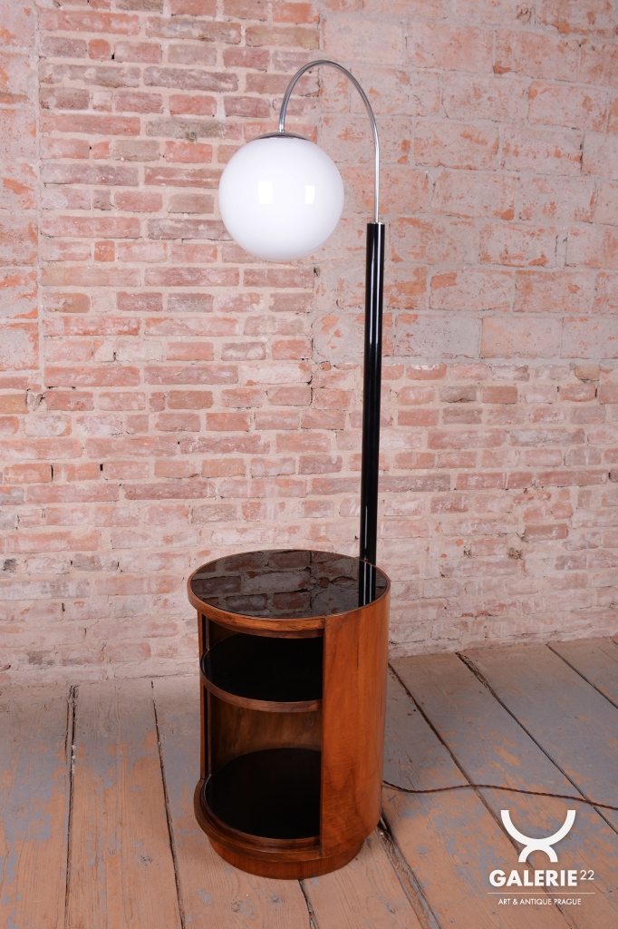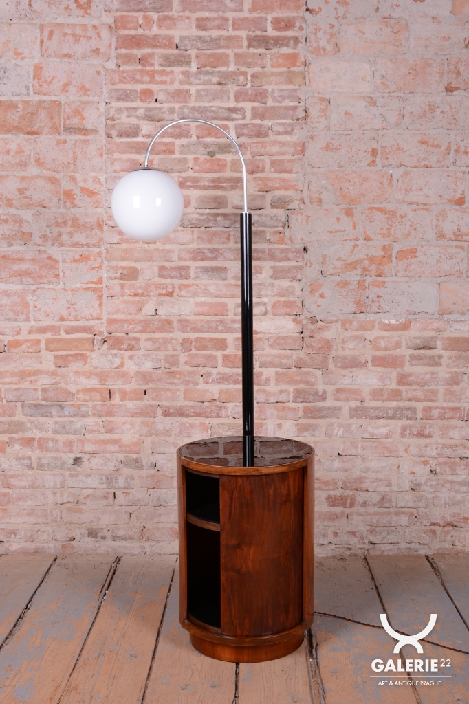 Tato podlahová lampa je jedním z nejzajímavějších a nejvíce multifunkčních návrhů architekta Jindřicha Halabaly, vyrobený v proslulých UP závodech ve 20. letech 20. století. Jde o fascinující spojení svítidla, odkládacího stolku a baru, které dokonale reprezentuje československé Art Deco. Tento kus nebyl pouhým kusem nábytku, ale technologickým symbolem moderního interiéru své doby.