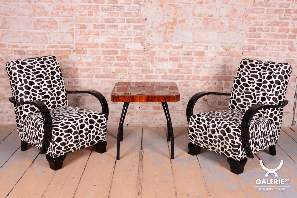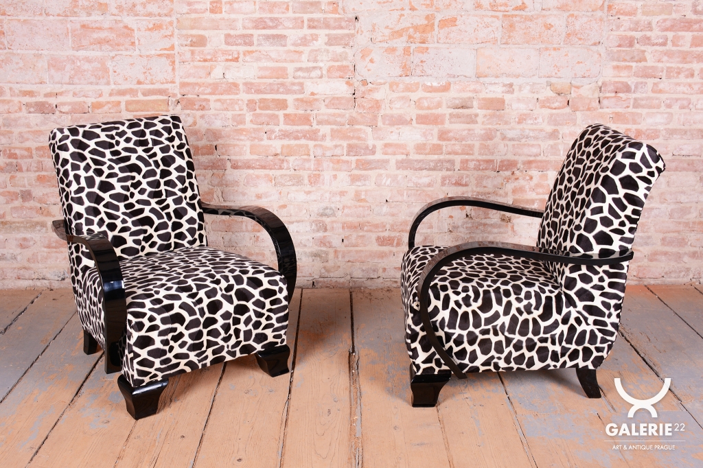 Tento pár křesel představuje vrcholnou eleganci a exkluzivitu československého Art Deca 20. let 20. století. V tomto raném období stylu se designéři nebáli dramatických kontrastů a luxusních materiálů, které měly uspokojit i tu nejnáročnější klientelu. Křesla v sobě spojují přísnou geometrii s hravostí avantgardních prvků, což z nich činí nepřehlédnutelný solitér v jakémkoliv interiéru.