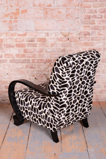 Křesla prošla náročným a kompletním restaurováním. Buková konstrukce byla nově lakována do černé politury ve vysokém lesku, známé jako pianový lak, který vytváří hluboký zrcadlový efekt. Velká pozornost byla věnována pohodlí a autenticitě: křesla mají tradiční pružinové čalounění a byla nově odborně očalouněna dle původní předlohy. Zvolená textilní látka imitující zvířecí srst je přímým odkazem na dobovou oblibu exotických motivů, které architekti v raném Art Decu s oblibou využívali pro zdůraznění přepychu a výjimečnosti.