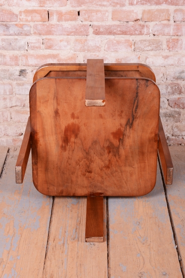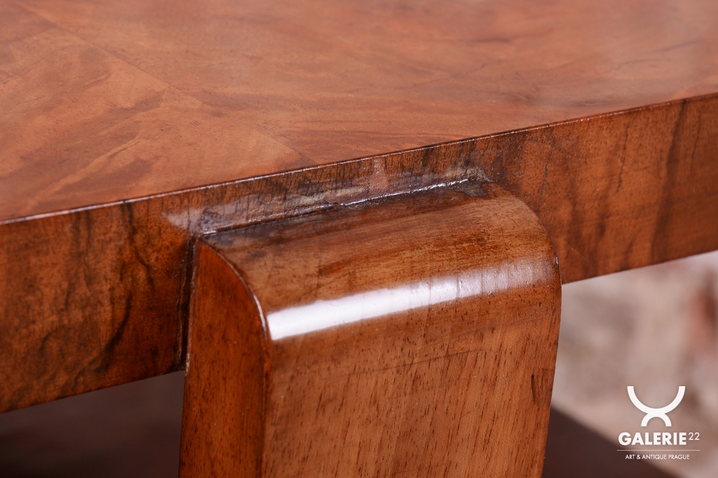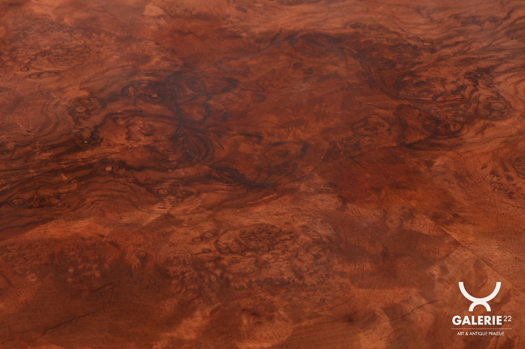 Předmět prošel odborným restaurováním. Konstrukce je vyrobena z bukové laťovky, která zajišťuje tvarovou stálost a pevnost, a je dýhována ušlechtilým ořechem. Původní politura dřeva byla citlivě oživena, díky čemuž vynikla přirozená hloubka ořechové kresby a její medově hnědé odstíny. Stolek má stabilní konstrukci a je ve vynikajícím stavu, připraven k okamžitému užívání.