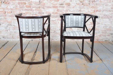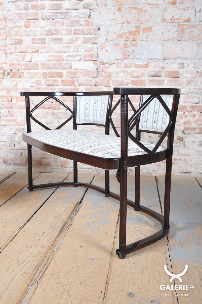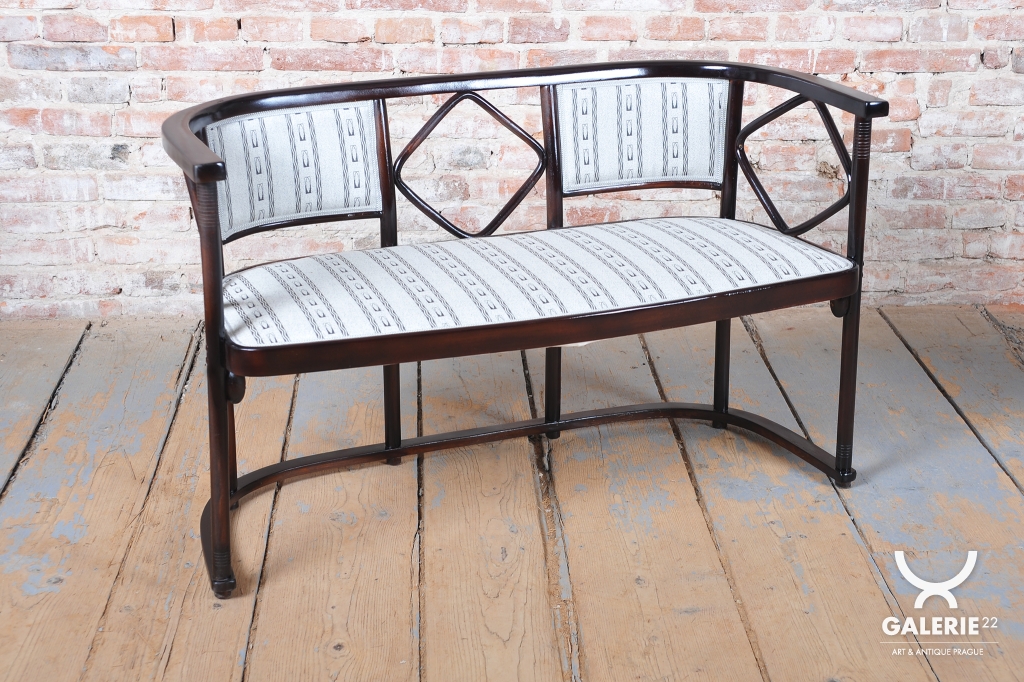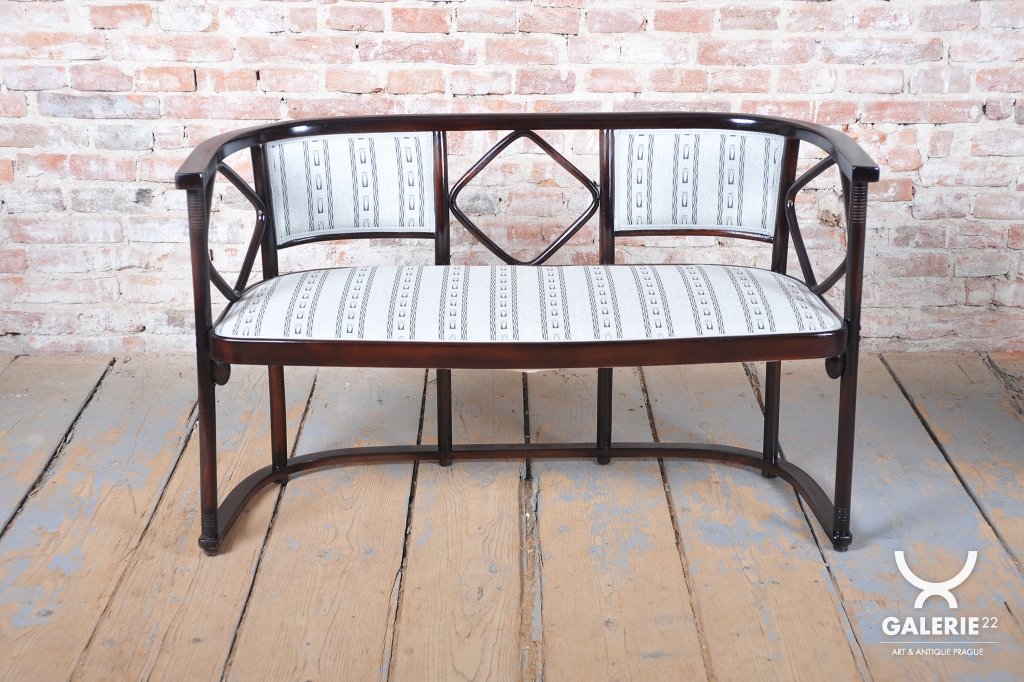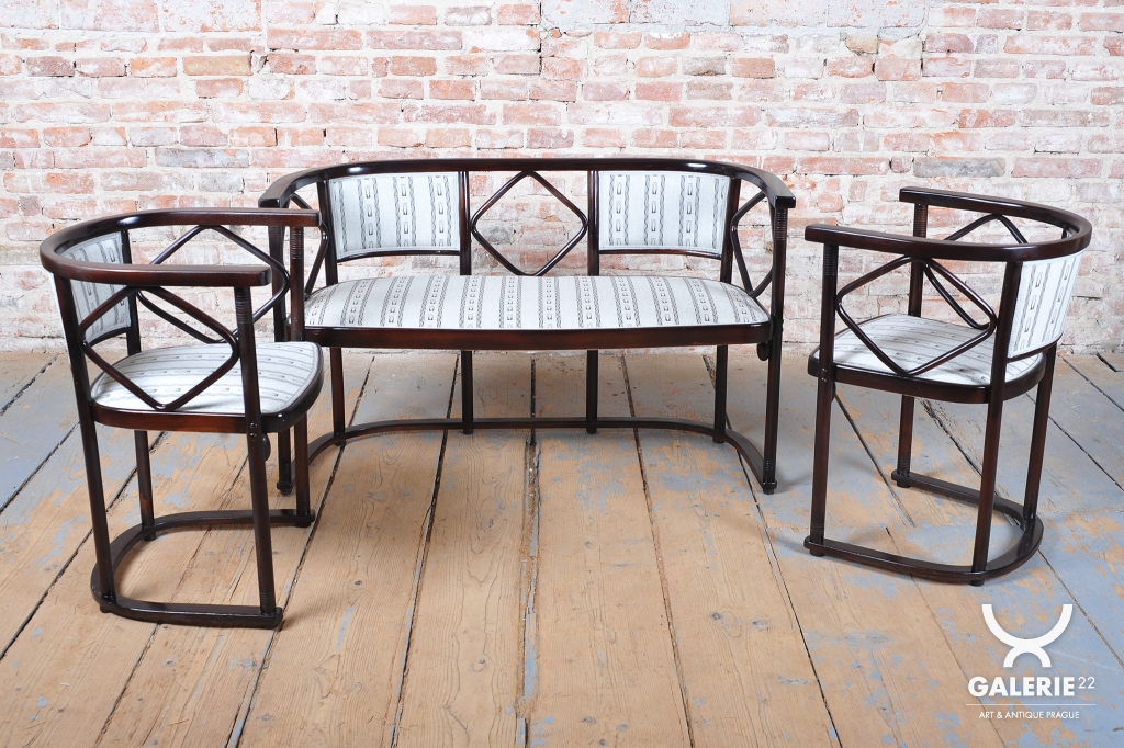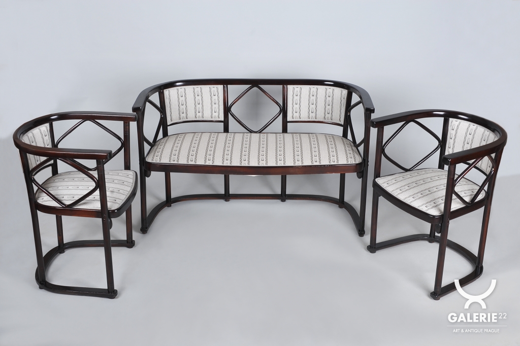 Tato sedací souprava, sestávající z pohovky a dvou křesel, představuje absolutní vrchol evropského designu počátku 20. století. Jedná se o mistrovské dílo vídeňské secese, které navrhl vizionářský architekt a spoluzakladatel Wiener Werkstätte, Josef Hoffmann, pro prestižní firmu J. & J. Kohn. Hoffmannův nezaměnitelný styl, založený na geometrické přísnosti a hře s čtvercovými motivy, zde předznamenává nástup moderní architektury a art deca.