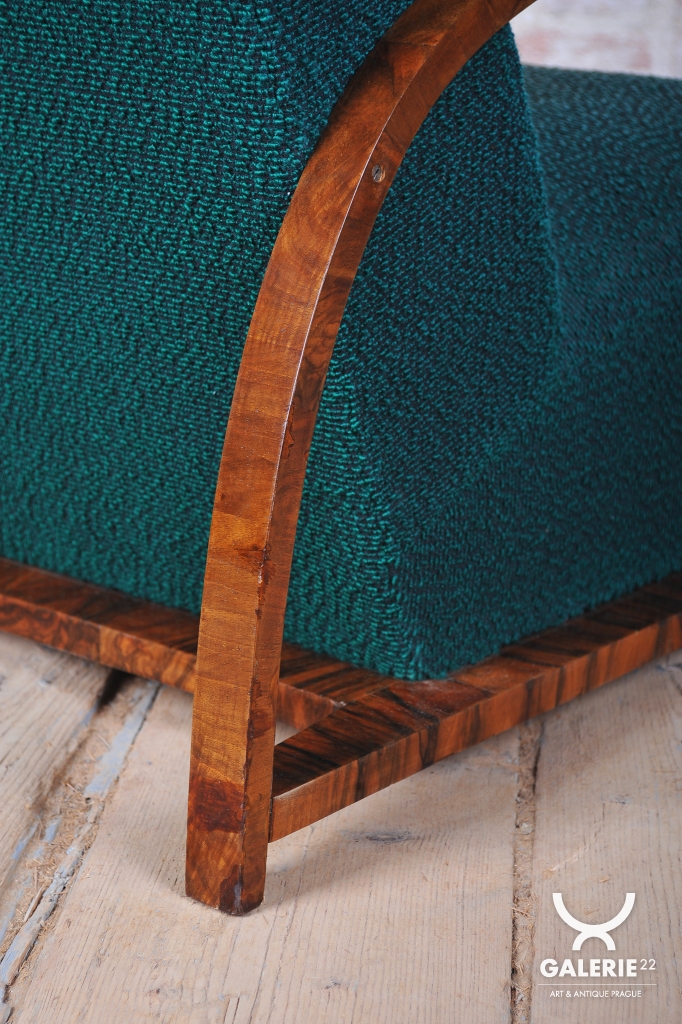 Předmět prošel odborným restaurováním dřevěných částí. Základní konstrukce z bukového masivu je dýhována ušlechtilým ořechem, jehož bohatá kresba tvoří hlavní dekorativní prvek. Původní politura byla citlivě oživena, což dřevu navrátilo jeho přirozenou hloubku a hedvábný lesk. Výjimečným aspektem tohoto kusu je stav čalounění: křeslo disponuje velmi zachovalým, neprosezeným pružinovým jádrem a původní potahovou látkou, která byla pouze odborně strojově vyčištěna. Tato autentická textilie nese neopakovatelný dobový charakter a svědčí o vysoké kvalitě materiálů i pečlivém zacházení předchozích majitelů.