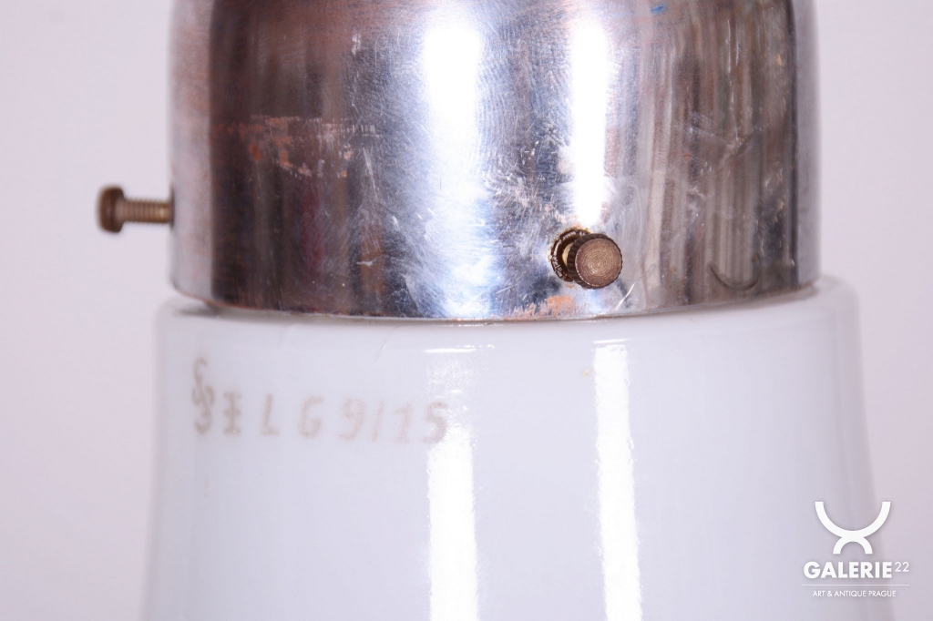 Tento lustr je autentickým zástupcem funkcionalistického osvětlení z produkce renomovaného pražského podniku Napako. Pochází z 30. let 20. století a představuje esenci hnutí Bauhaus v Československu. Jeho design se vyznačuje přísnou účelností a geometrickou čistotou, která byla ve své době revoluční. Základem svítidla je konstrukce z chromované oceli, která byla profesionálně vyčištěna do zrcadlového lesku. Kompozici doplňuje elegantní stínidlo z bílého opálového skla o průměru 18 cm, které díky své mléčné textuře poskytuje měkké, rovnoměrně rozptýlené světlo ideální pro moderní obytný i pracovní prostor.