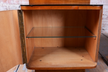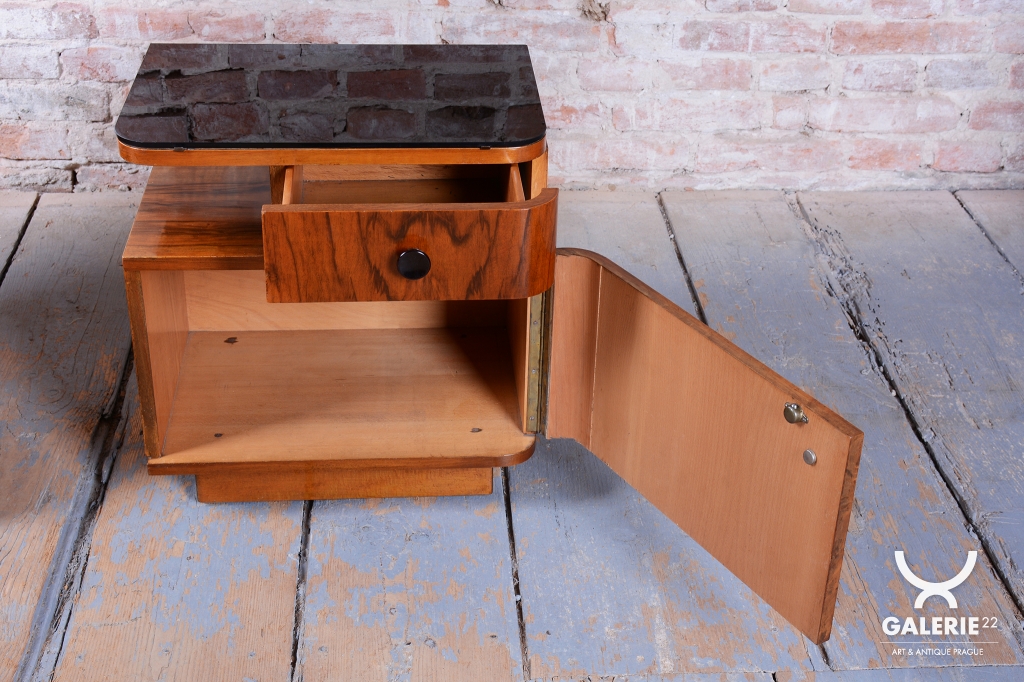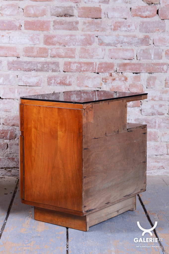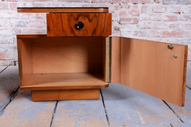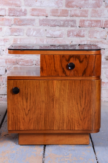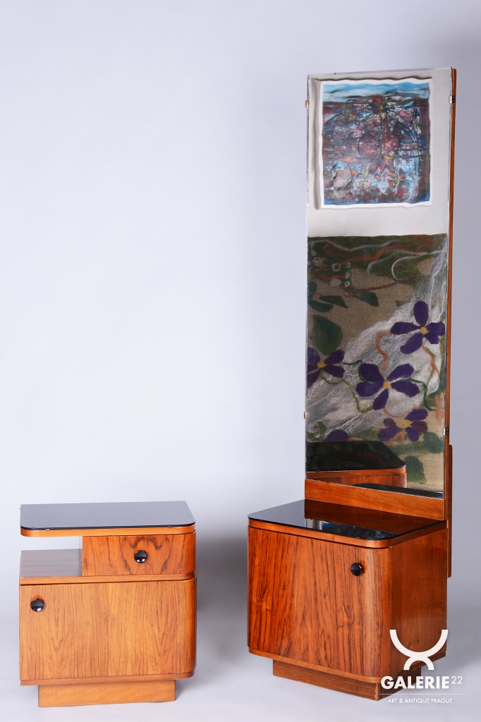 Představujeme výjimečný komplet ložnicového nábytku, který tvoří elegantní toaletní stolek a jeden (původně nesymetrický) noční stolek. Tento set představuje fascinující spojení elegance Art Deca a čistých linií Mid-Century Modern stylu, datované na přelom těchto dvou ikonických období.