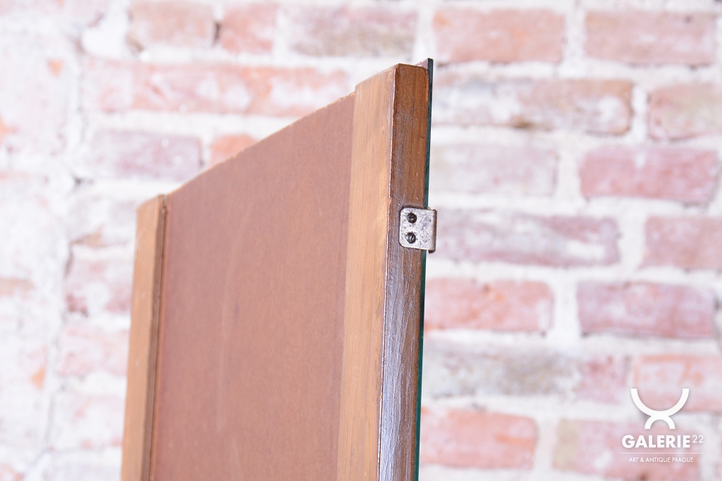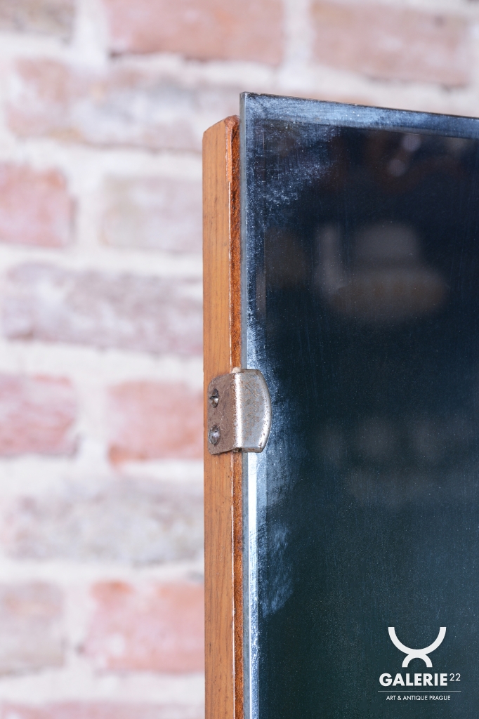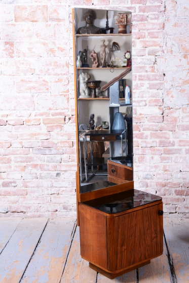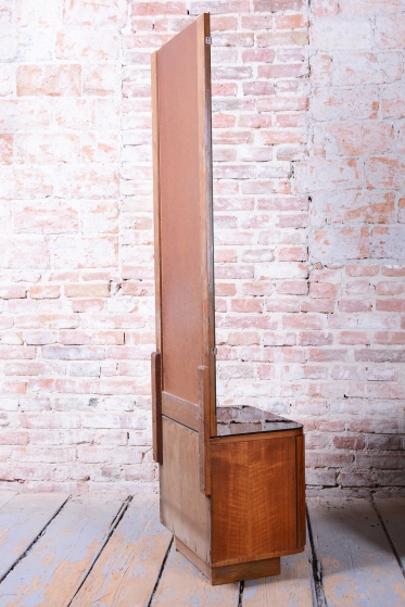Konstrukce je zhotovena z laťovky dýhované luxusní ořechovou dýhou s nádhernou, bohatou kresbou. Toaletka je osazena vysokým, originálním skleněným zrcadlem. Nábytek byl profesionálně restaurován a prošel refrešem původní politury, čímž se oživila hloubka a lesk dýhy.